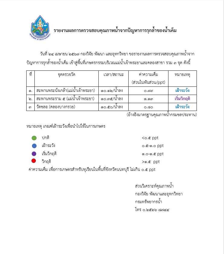 รายงานผลการตรวจสอบคุณภาพน้ำจากปัญหารุกล้ำของน้ำเค็ม วันที่ 26 เมษายน 2567