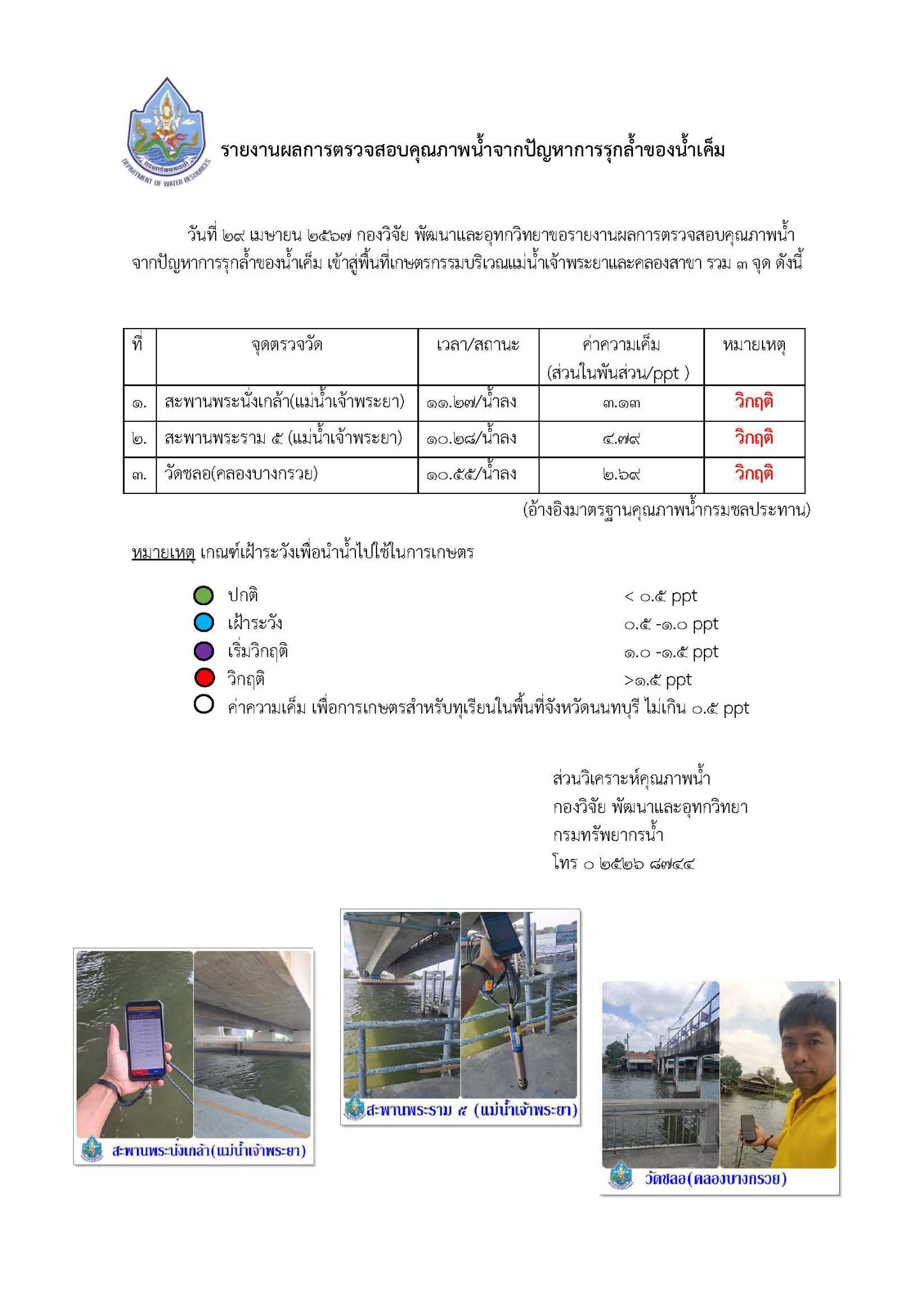รายงานผลการตรวจสอบคุณภาพน้ำจากปัญหารุกล้ำของน้ำเค็ม วันที่ 29 เมษายน 2567