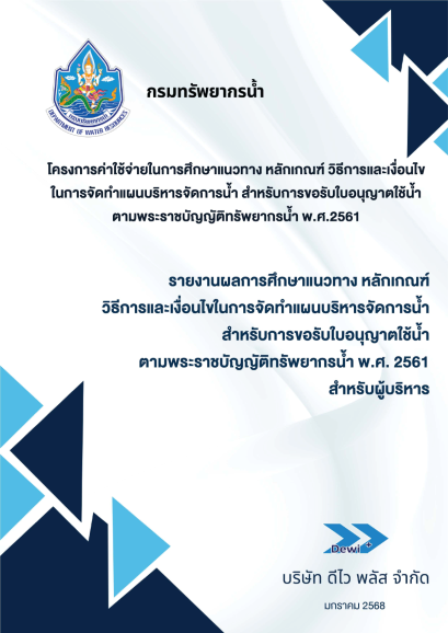 รายงานผลการศึกษา แนวทาง หลักเกณฑ์ วิธีการและเงื่อนไขในการจัดทำแผนบริหารจัดการน้ำสำหรับการขอรับใบอนุญาตใช้น้ำ ตาม พ.ร.บ.ทรัพยากรน้ำ พ.ศ.2561 สำหรับผู้บริหาร