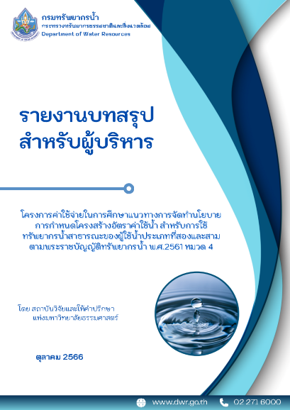 โครงการค่าใช้จ่ายในการศึกษาแนวทางการจัดทำนโยบายการกำหนดโครงสร้างอัตราค่าใช้น้ำสำหรับการใช้ทรัพยากรน้ำ สาธารณะของผู้ใช้น้ำประเภทที่สองและสามตาม พ.ร.บ.น้ำ พ.ศ.2561 หมวด 4 (รายงานบทสรุปสำหรับผู้บริหาร)