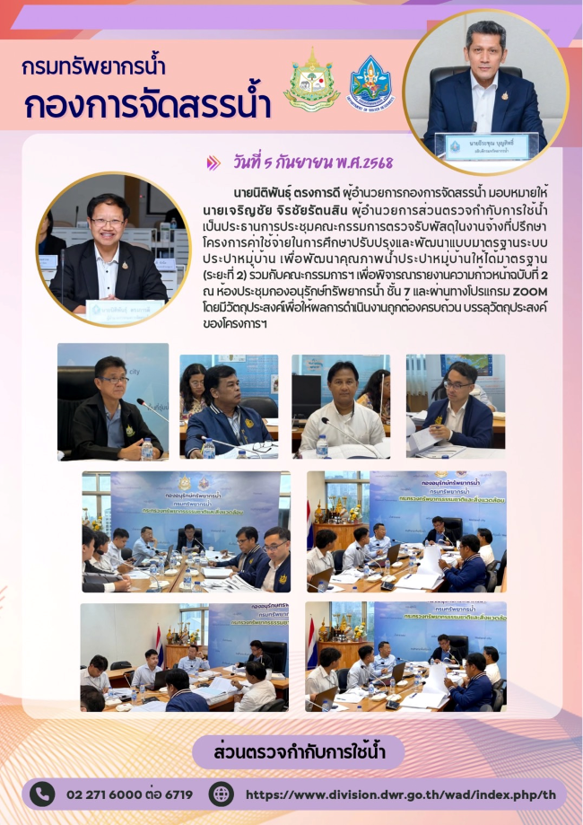 เมื่อวันที่ 5 ก.ย. 2569 นายนิติพันธ์ ตรงการดี ผู้อำนวยการกองการจัดสรรน้ำ มอบหมายให้นายเจริญชัย จิรชัยรัตนสิน ผู้อำนวยการส่วนตรวจกำกับการใช้น้ำเป็นประธานการประชุม