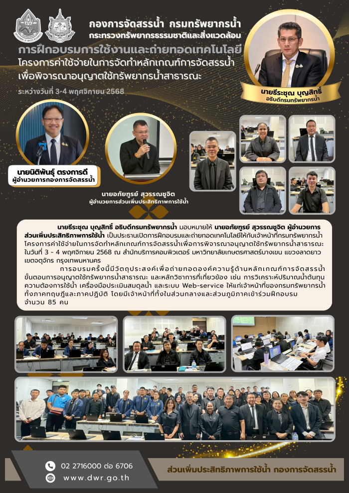 ให้กับเจ้าหน้าที่กรบทรัพยากรน้ำโครงการค่าใช้จ่ายในการจัดทำหลักเกณฑ์การจัดสรรนำเพื่อการพิจารณาอนุญาตใช้ทรัพยากรน้ำสาธารณะในวันที่ 3 - 4 พฤศจิกายน 2568