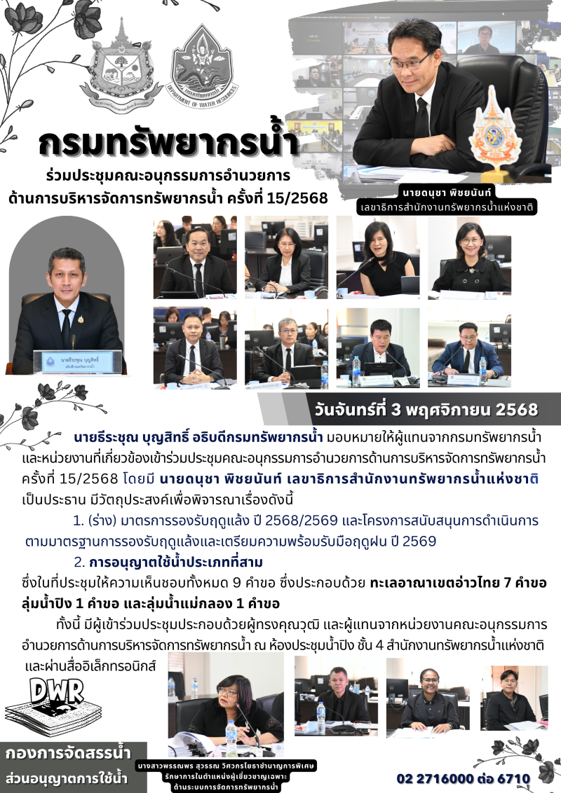 คณะอนุกรรมการอำนวยการด้านการบริหารจัดการกรัพยากรน้ำครั้งที่ 15/2568 โดยมี นายดนุชา พิชยยนันท์ เลขาธิการสำนักงานทรัพยากรน้ำแห่งชาติเป็นประธาน