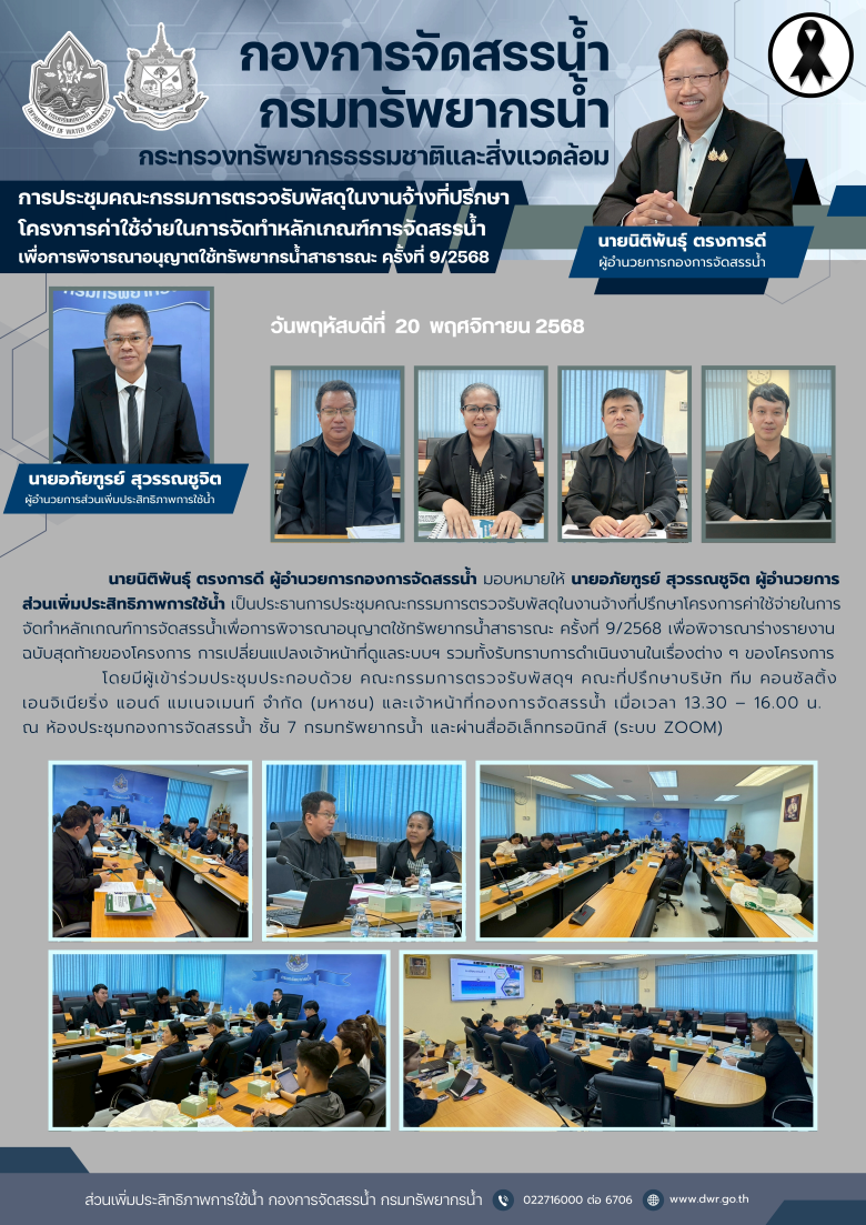 เป็นประธานการประชุมคณะกรรมการตรวจรับพัสดุในงานจ้างที่ปรึกษาโครงการค่าใช้จ่ายในการจัดทำหลักเกณฑ์การจัดสรรน้ำเพื่อการพิจารณาอนุญาตใช้ทรัพยากรน้ำสาธารณะ ครั้งที่ 9/2568