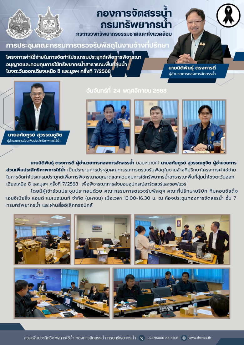 พื้นที่ลุ่มน่้ำโขงตะวันออกเฉียงเหนือ ชี และมูลฯ ครั้งที่ 7/2568 เพื่อพิจารณาการส่งมอบอุปกรณ์ฮาร์ดแวร์และซอฟแวร์ โดยมีผู้เข้าร่วมประชุมประกอบด้วย คณะกรรมการตรวจรับพัสดุฯ