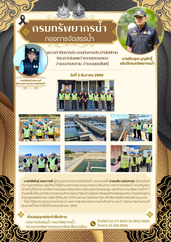 เมื่อวันที่ 3 ธันวาคม 2568 นายนิติพันธุ์ ตรงการดี ผู้อำนวยการกองการจัดสรรน้ำ มอบหมายให้ นายวศิน แจ่มสากล วิศวกรโยธาชำนาญการพิเศษ ปฎิบัติหน้าที่ผู้อำนวยการส่วนอนุญาตประปาสัมปทาน