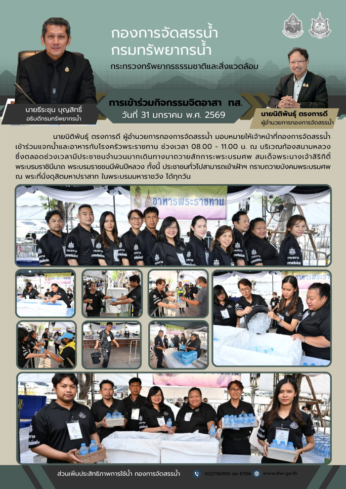 เมื่อวันที่ 31 มกราคม พ.ศ. 2569 นายนิติพันธุ์ ตรงการดี ผู้อำนวยการกองการจัดสรรน้ำ มอบหมายให้เจ้าหน้าที่กองการจัดสรรน้ำร่วมแจกน้ำและอาหารกับโรงครัวพระราชทาน