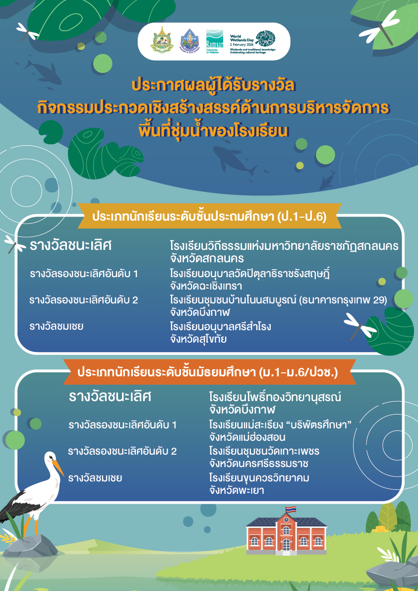 - 31 มี.ค. 2569 กอน. ลงพื้นที่จังหวัดลพบุรี ขับเคลื่อนโครงการจัดทำข้อมูล Ramsar Information Sheet มุ่งผลักดันพื้นที่ชุ่มน้ำไทยสู่ระดับสากล จังหวัดลพบุรี