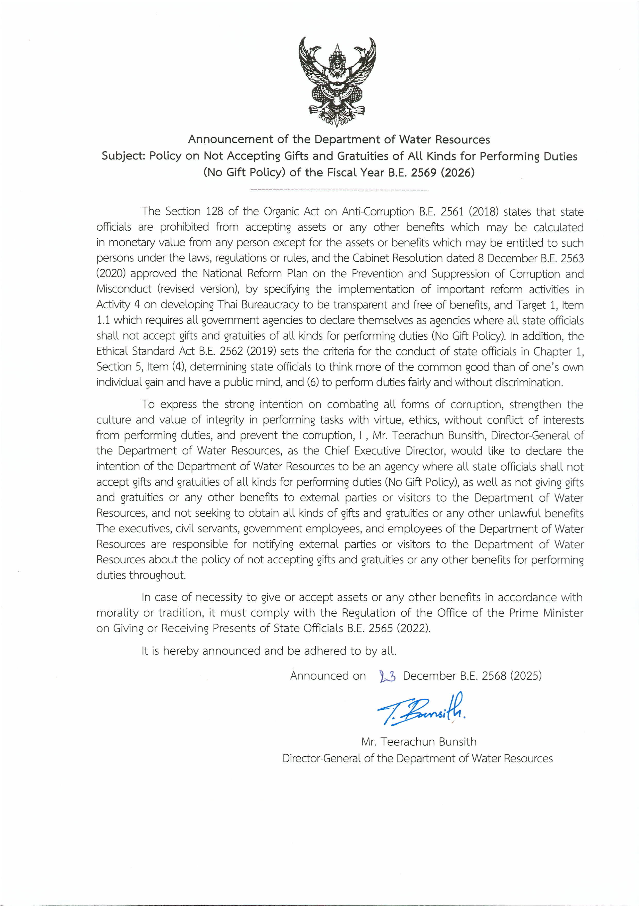 - ประกาศ No Gift Policy - DWR (Thai-Eng) 2568