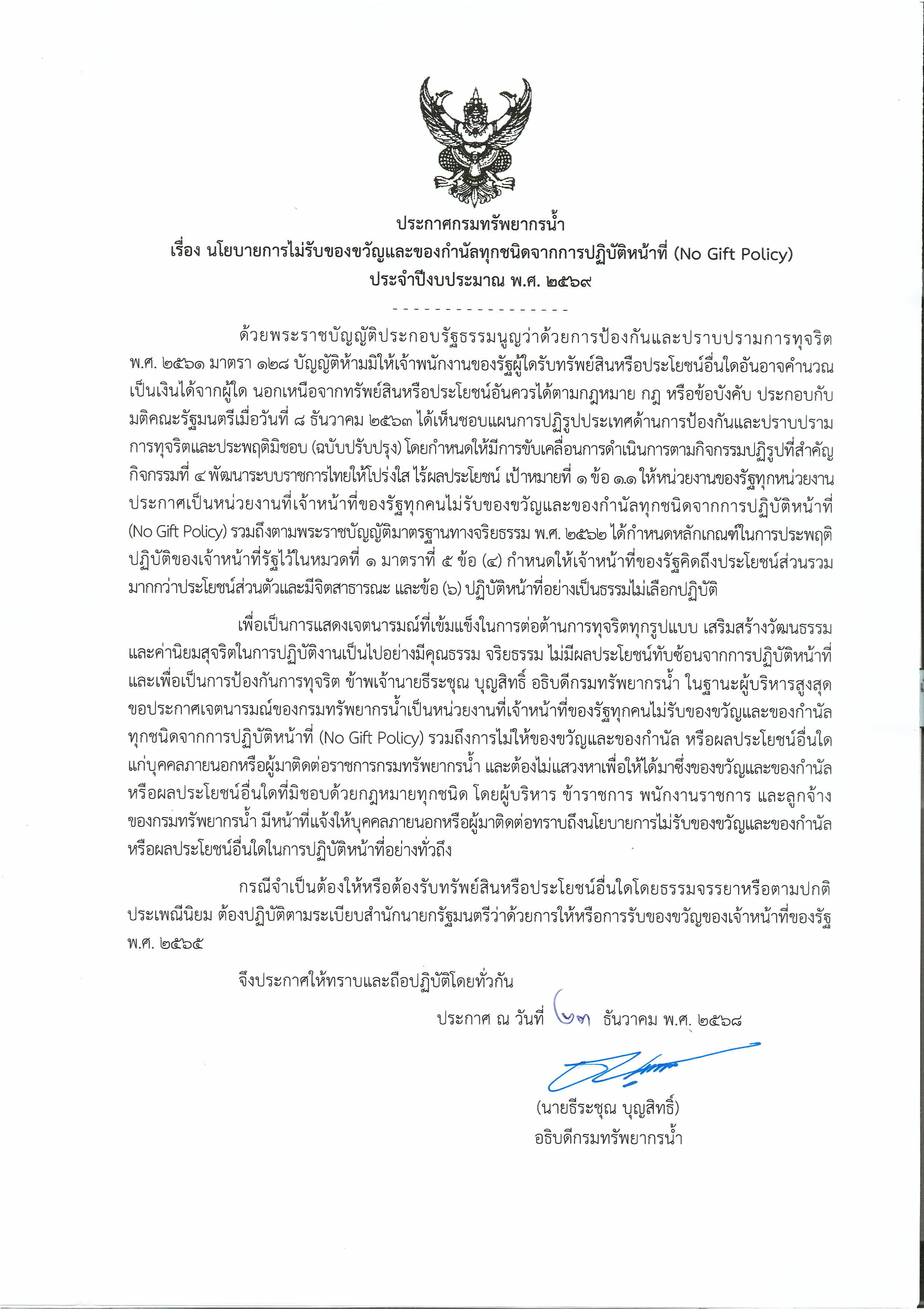 " กระทรวงทรัพยากรธรรมชาติและสิ่งแวดล้อม ประจำปีงบประมาณ พ.ศ. 2566 - ประกาศกรมทรัพยากรน้ำ เรื่อง นโยบายการไม่รับของขวัญและของกำนัลทุกชนิดจากการปฏิบัติหน้าที่ (No Gift Policy)