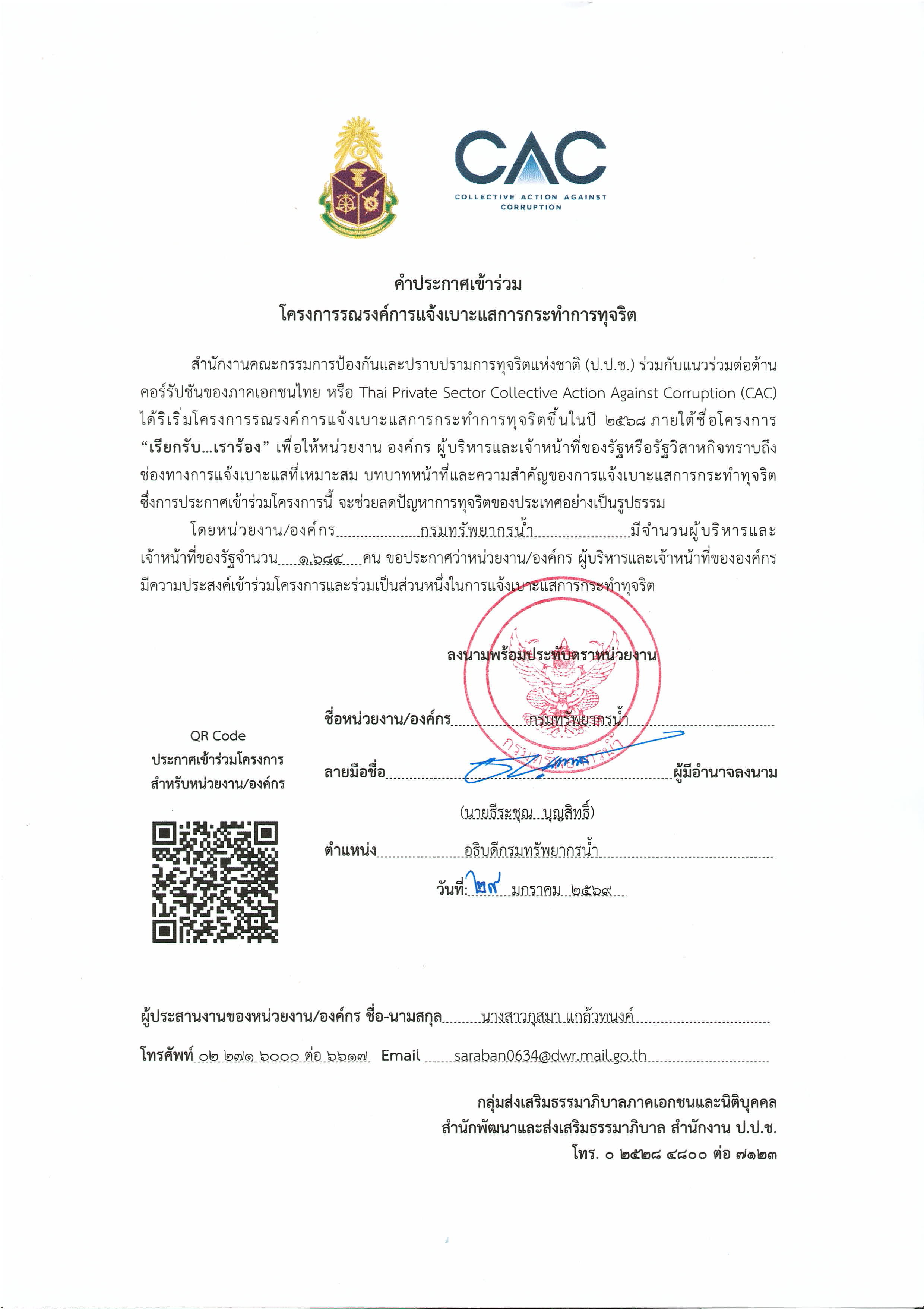 กรมทรัพยากรน้ำ ประกาศเข้าร่วม โครงการรณรงค์การแจ้งเบาะแสการกระทำการทุจริต เมื่อวันที่ 29 มกราคม 2569
