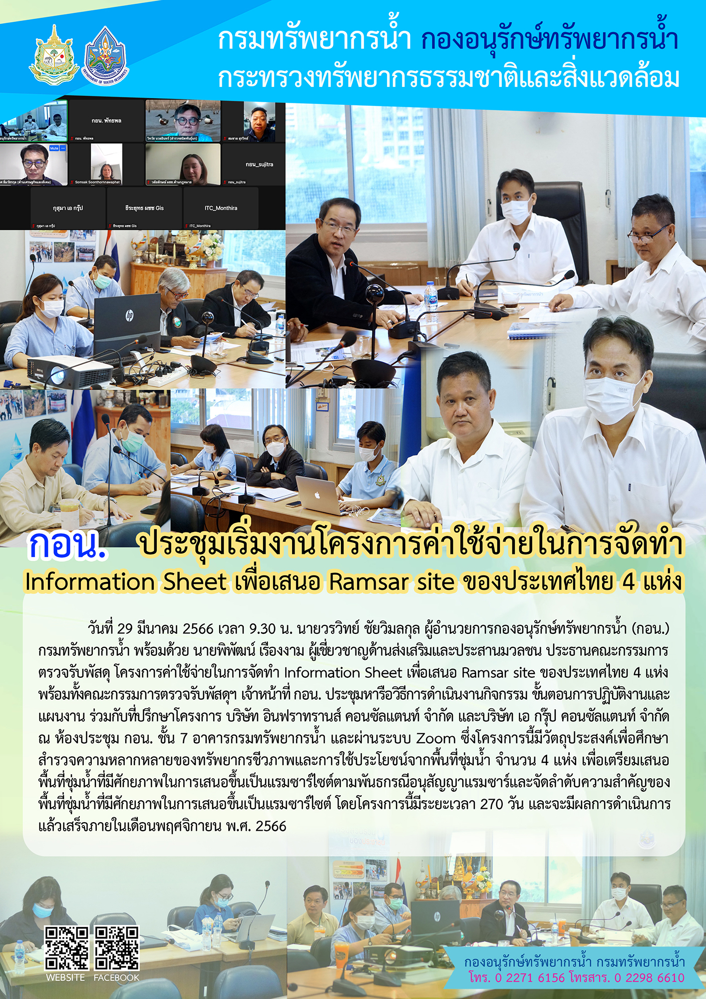 วันที่ 29 มีนาคม 2566 เวลา 9.30 น. นายวรวิทย์ ชัยวิมลกุล ผู้อำนวยการกองอนุรักษ์ทรัพยากรน้ำ (กอน.) กรมทรัพยากรน้ำ พร้อมด้วย นายพิพัฒน์ เรืองงาม ผู้เชี่ยวชาญด้านส่งเสริมและประสานมวลชน ประธานคณะกรรมการตรวจรับพัสดุ โครงการค่าใช้จ่ายในการจัดทำ Information Sheet เพื่อเสนอ Ramsar site ของประเทศไทย 4 แห่ง พร้อมทั้งคณะกรรมการตรวจรับพัสดุฯ เจ้าหน้าที่ กอน. ประชุมหารือวิธีการดำเนินงานกิจกรรม ขั้นตอนการปฏิบัติงานและแผนงาน ร่วมกับที่ปรึกษาโครงการ บริษัท อินฟราทรานส์ คอนซัลแตนท์ จำกัด และบริษัท เอ กรุ๊ป คอนซัลแตนท์ จำกัด ณ ห้องประชุม กอน. ชั้น 7 อาคารกรมทรัพยากรน้ำ และผ่านระบบ Zoom