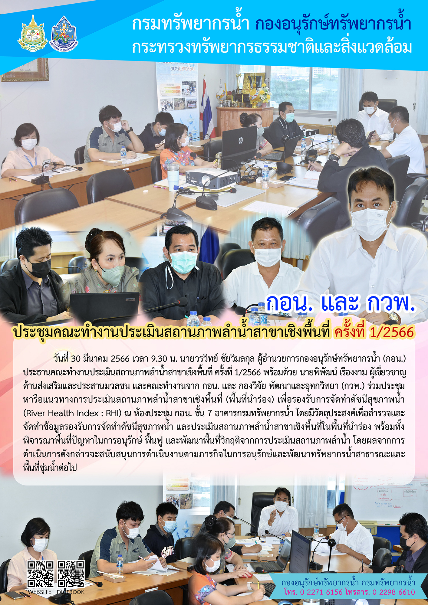 วันที่ 30 มีนาคม 2566 เวลา 9.30 น. นายวรวิทย์ ชัยวิมลกุล ผู้อำนวยการกองอนุรักษ์ทรัพยากรน้ำ (กอน.) ประธานคณะทำงานประเมินสถานภาพลำน้ำสาขาเชิงพื้นที่ ครั้งที่ 1/2566 พร้อมด้วย นายพิพัฒน์ เรืองงาม ผู้เชี่ยวชาญด้านส่งเสริมและประสานมวลชน และคณะทำงานจาก กอน. และ กองวิจัย พัฒนาและอุทกวิทยา (กวพ.) ร่วมประชุมหารือแนวทางการประเมินสถานภาพลำน้ำสาขาเชิงพื้นที่ (พื้นที่นำร่อง) เพื่อรองรับการจัดทำดัชนีสุขภาพน้ำ (River Health Index : RHI) ณ ห้องประชุม กอน. ชั้น 7 กรมทรัพยากรน้ำ