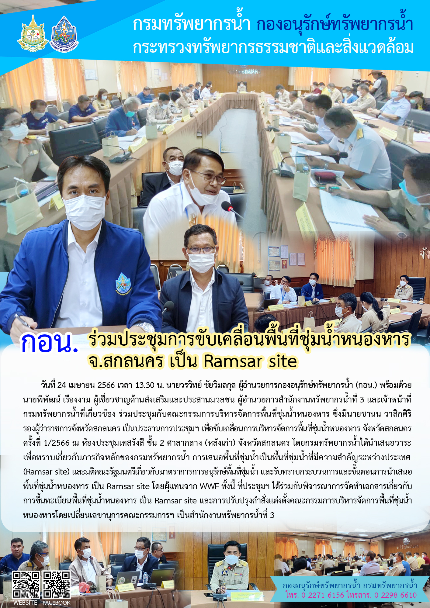 วันที่ 24 เมษายน 2566 เวลา 13.30 น. นายวรวิทย์ ชัยวิมลกุล ผู้อำนวยการกองอนุรักษ์ทรัพยากรน้ำ (กอน.) พร้อมด้วย นายพิพัฒน์ เรืองงาม ผู้เชี่ยวชาญด้านส่งเสริมและประสานมวลชน ผู้อำนวยการสำนักงานทรัพยากรน้ำที่ 3 และเจ้าหน้าที่กรมทรัพยากรน้ำที่เกี่ยวข้อง ร่วมประชุมกับคณะกรรมการบริหารจัดการพื้นที่ชุ่มน้ำหนองหาร ซึ่งมีนายชานน วาสิกศิริ รองผู้ว่าราชการจังหวัดสกลนคร เป็นประธานการประชุมฯ เพื่อขับเคลื่อนการบริหารจัดการพื้นที่ชุ่มน้ำหนองหาร จังหวัดสกลนคร ครั้งที่ 1/2566 ณ ห้องประชุมเทสรังสี ชั้น 2 ศาลากลาง (หลังเก่า) จังหวัดสกลนคร
