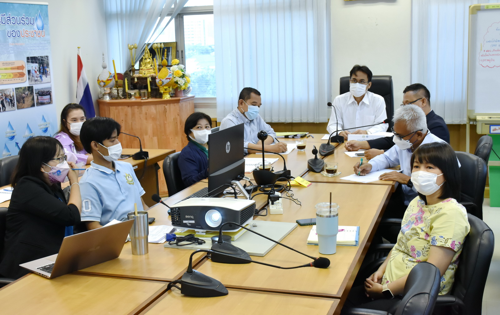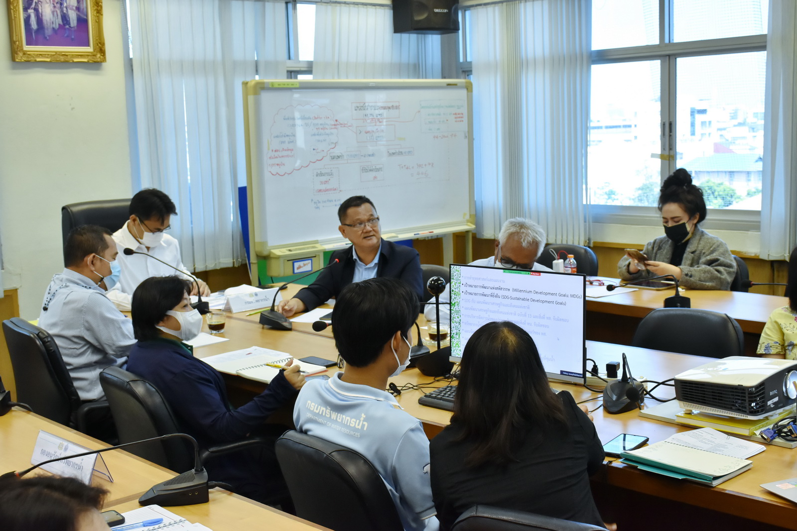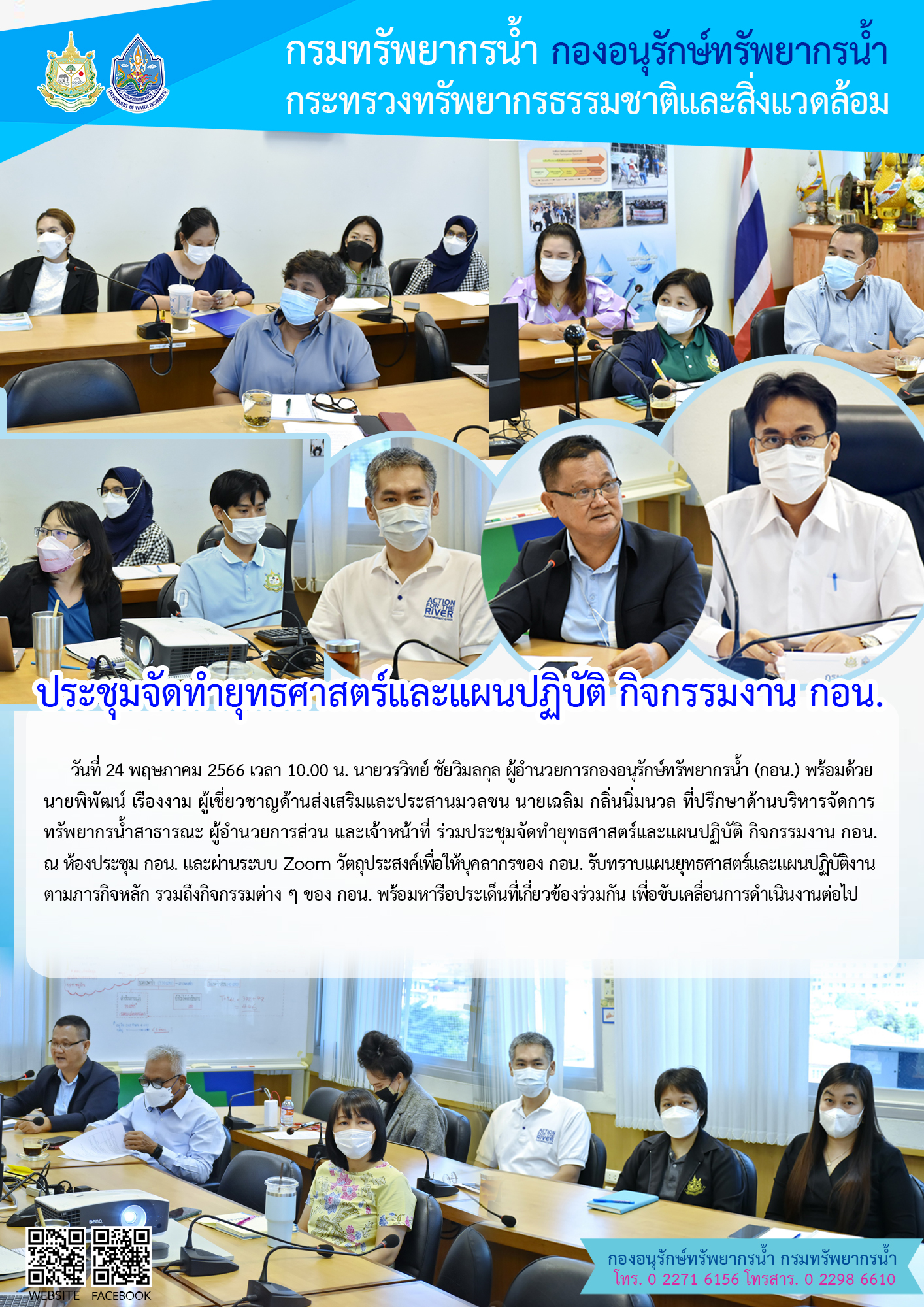 วันที่ 24 พฤษภาคม 2566 เวลา 10.00 น. นายวรวิทย์ ชัยวิมลกุล ผู้อำนวยการกองอนุรักษ์ทรัพยากรน้ำ (กอน.) พร้อมด้วย นายพิพัฒน์ เรืองงาม ผู้เชี่ยวชาญด้านส่งเสริมและประสานมวลชน นายเฉลิม กลิ่นนิ่มนวล ที่ปรึกษาด้านบริหารจัดการทรัพยากรน้ำสาธารณะ ผู้อำนวยการส่วน และเจ้าหน้าที่ ร่วมประชุมจัดทำยุทธศาสตร์และแผนปฏิบัติ กิจกรรมงาน กอน. ณ ห้องประชุม กอน. และผ่านระบบ Zoom