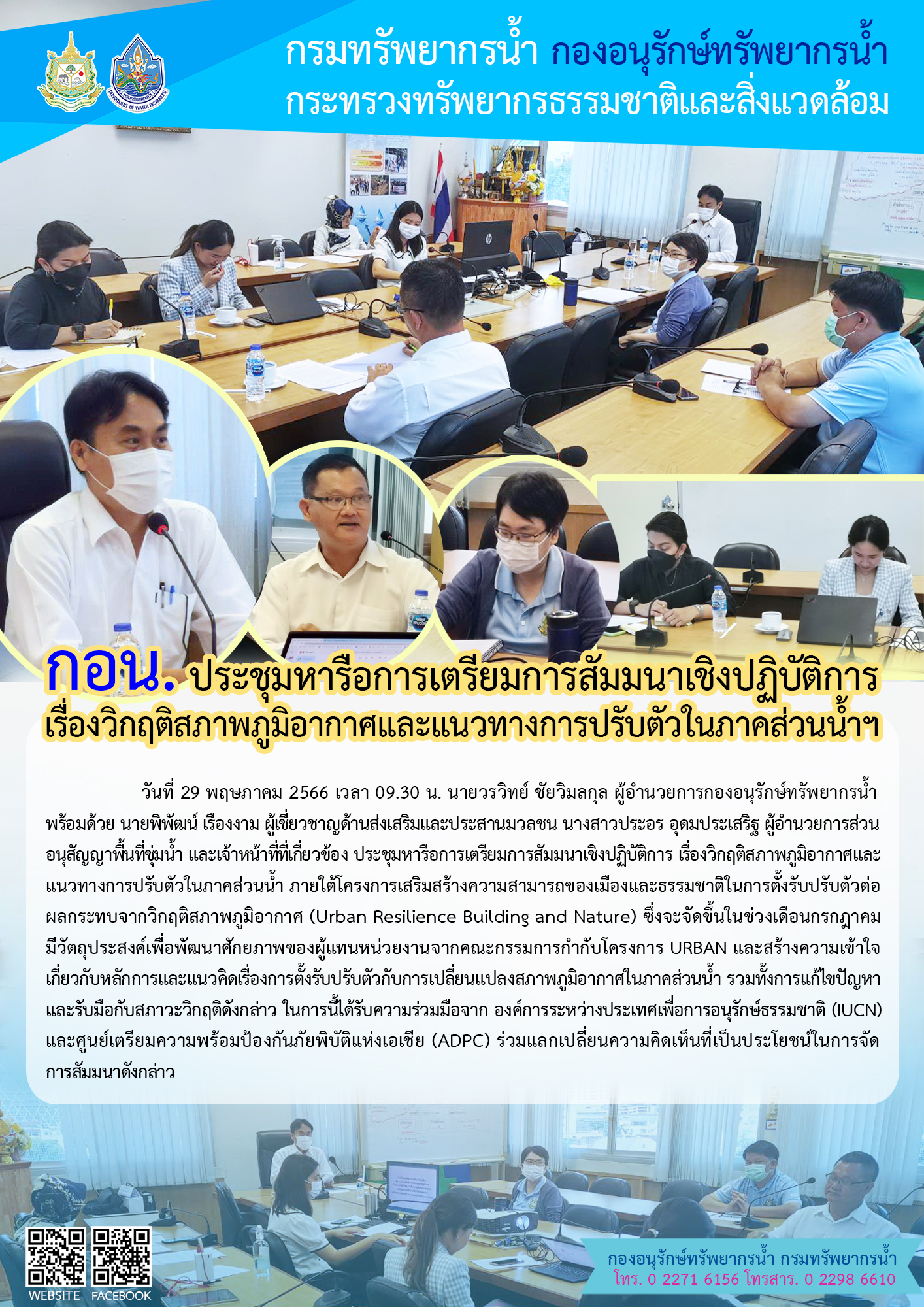 วันที่ 29 พฤษภาคม 2566 เวลา 09.30 น. นายวรวิทย์ ชัยวิมลกุล ผู้อำนวยการกองอนุรักษ์ทรัพยากรน้ำ พร้อมด้วย นายพิพัฒน์ เรืองงาม ผู้เชี่ยวชาญด้านส่งเสริมและประสานมวลชน นางสาวประอร อุดมประเสริฐ ผู้อำนวยการส่วนอนุสัญญาพื้นที่ชุ่มน้ำ และเจ้าหน้าที่ที่เกี่ยวข้อง ประชุมหารือการเตรียมการสัมมนาเชิงปฏิบัติการ เรื่องวิกฤติสภาพภูมิอากาศและแนวทางการปรับตัวในภาคส่วนน้ำ ภายใต้โครงการเสริมสร้างความสามารถของเมืองและธรรมชาติในการตั้งรับปรับตัวต่อผลกระทบจากวิกฤติสภาพภูมิอากาศ (Urban Resilience Building and Nature) ซึ่งจะจัดขึ้นในช่วงเดือนกรกฎาคม