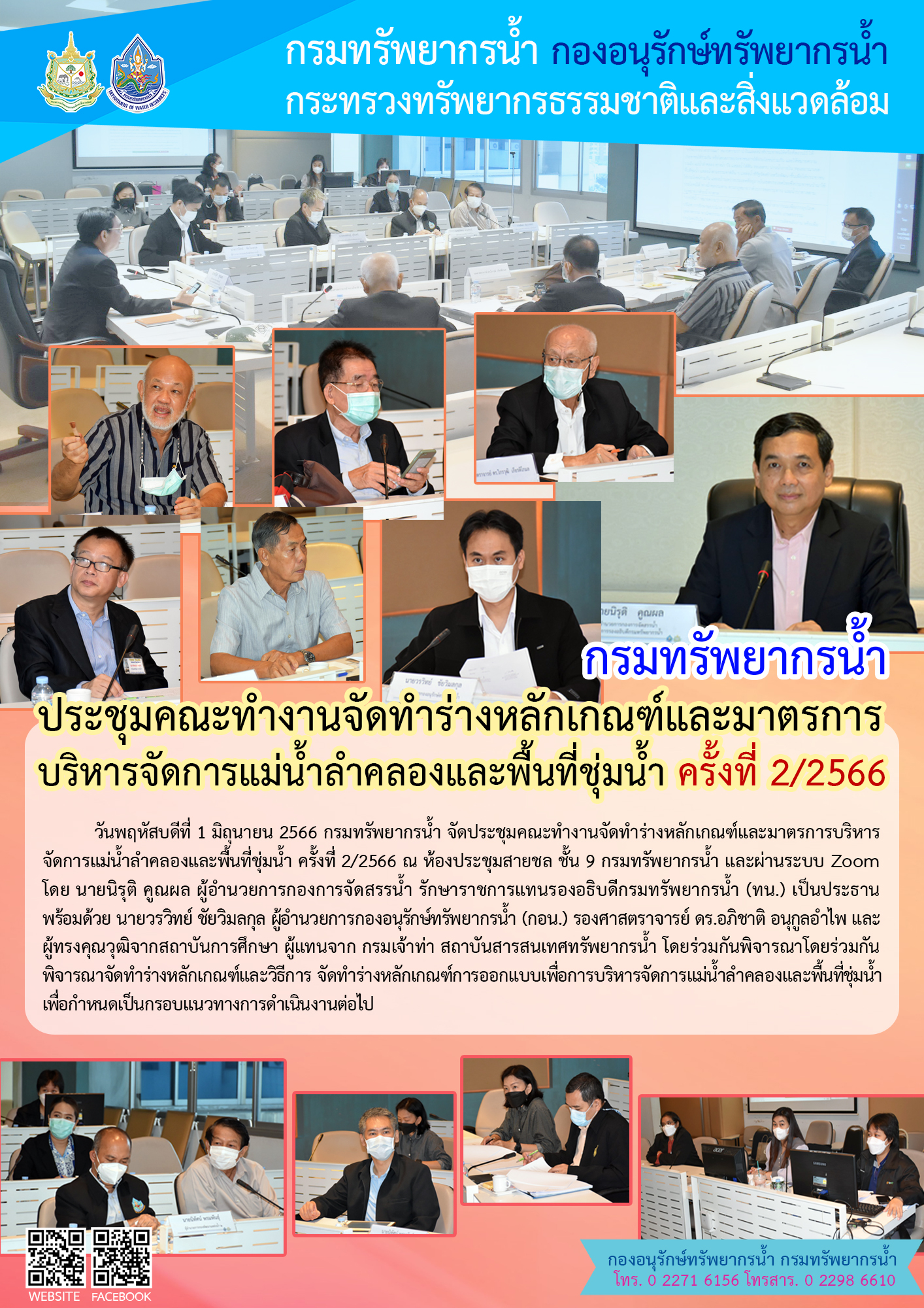 วันพฤหัสบดีที่ 1 มิถุนายน 2566 กรมทรัพยากรน้ำ จัดประชุมคณะทำงานจัดทำร่างหลักเกณฑ์และมาตรการบริหารจัดการแม่น้ำลำคลองและพื้นที่ชุ่มน้ำ ครั้งที่ 2/2566 ณ ห้องประชุมสายชล ชั้น 9 กรมทรัพยากรน้ำ และผ่านระบบ Zoom โดย นายนิรุติ คูณผล ผู้อำนวยการกองการจัดสรรน้ำ รักษาราชการแทนรองอธิบดีกรมทรัพยากรน้ำ (ทน.) เป็นประธาน พร้อมด้วย นายวรวิทย์ ชัยวิมลกุล ผู้อำนวยการกองอนุรักษ์ทรัพยากรน้ำ (กอน.) รองศาสตราจารย์ ดร.อภิชาติ อนุกูลอำไพ และผู้ทรงคุณวุฒิจากสถาบันการศึกษา ผู้แทนจาก กรมเจ้าท่า สถาบันสารสนเทศทรัพยากรน้ำ โดยร่วมกันพิจารณาจัดทำร่างหลักเกณฑ์และวิธีการ จัดทำร่างหลักเกณฑ์การออกแบบเพื่อการบริหารจัดการแม่น้ำลำคลองและพื้นที่ชุ่มน้ำ เพื่อกำหนดเป็นกรอบแนวทางการดำเนินงานต่อไป