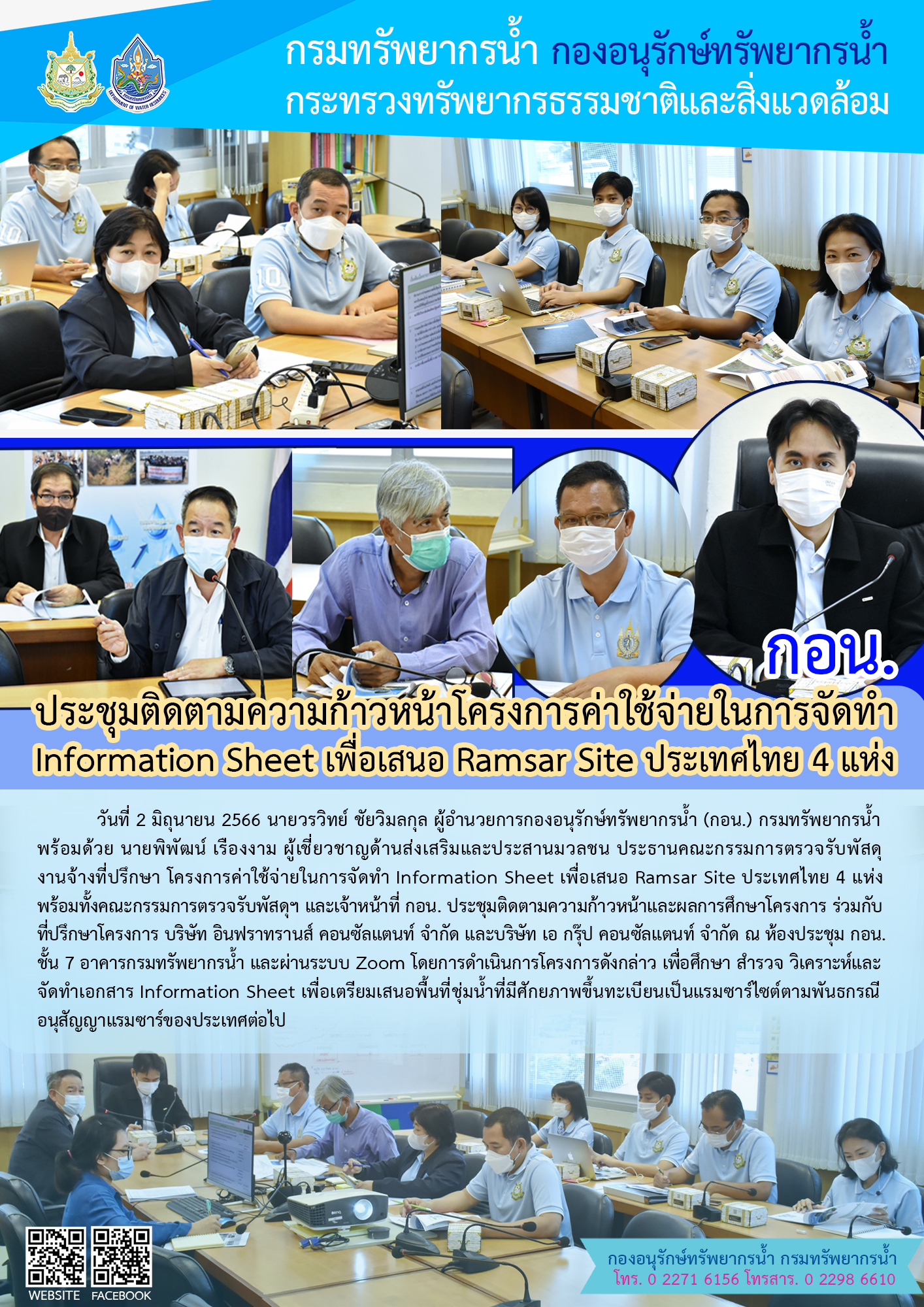 วันที่ 2 มิถุนายน 2566 นายวรวิทย์ ชัยวิมลกุล ผู้อำนวยการกองอนุรักษ์ทรัพยากรน้ำ (กอน.) กรมทรัพยากรน้ำ พร้อมด้วย นายพิพัฒน์ เรืองงาม ผู้เชี่ยวชาญด้านส่งเสริมและประสานมวลชน ประธานคณะกรรมการตรวจรับพัสดุงานจ้างที่ปรึกษา โครงการค่าใช้จ่ายในการจัดทำ Information Sheet เพื่อเสนอ Ramsar Site ประเทศไทย 4 แห่ง พร้อมทั้งคณะกรรมการตรวจรับพัสดุฯ และเจ้าหน้าที่ กอน. ประชุมติดตามความก้าวหน้าและผลการศึกษาโครงการ ร่วมกับที่ปรึกษาโครงการ บริษัท อินฟราทรานส์ คอนซัลแตนท์ จำกัด และบริษัท เอ กรุ๊ป คอนซัลแตนท์ จำกัด ณ ห้องประชุม กอน. ชั้น 7 อาคารกรมทรัพยากรน้ำ