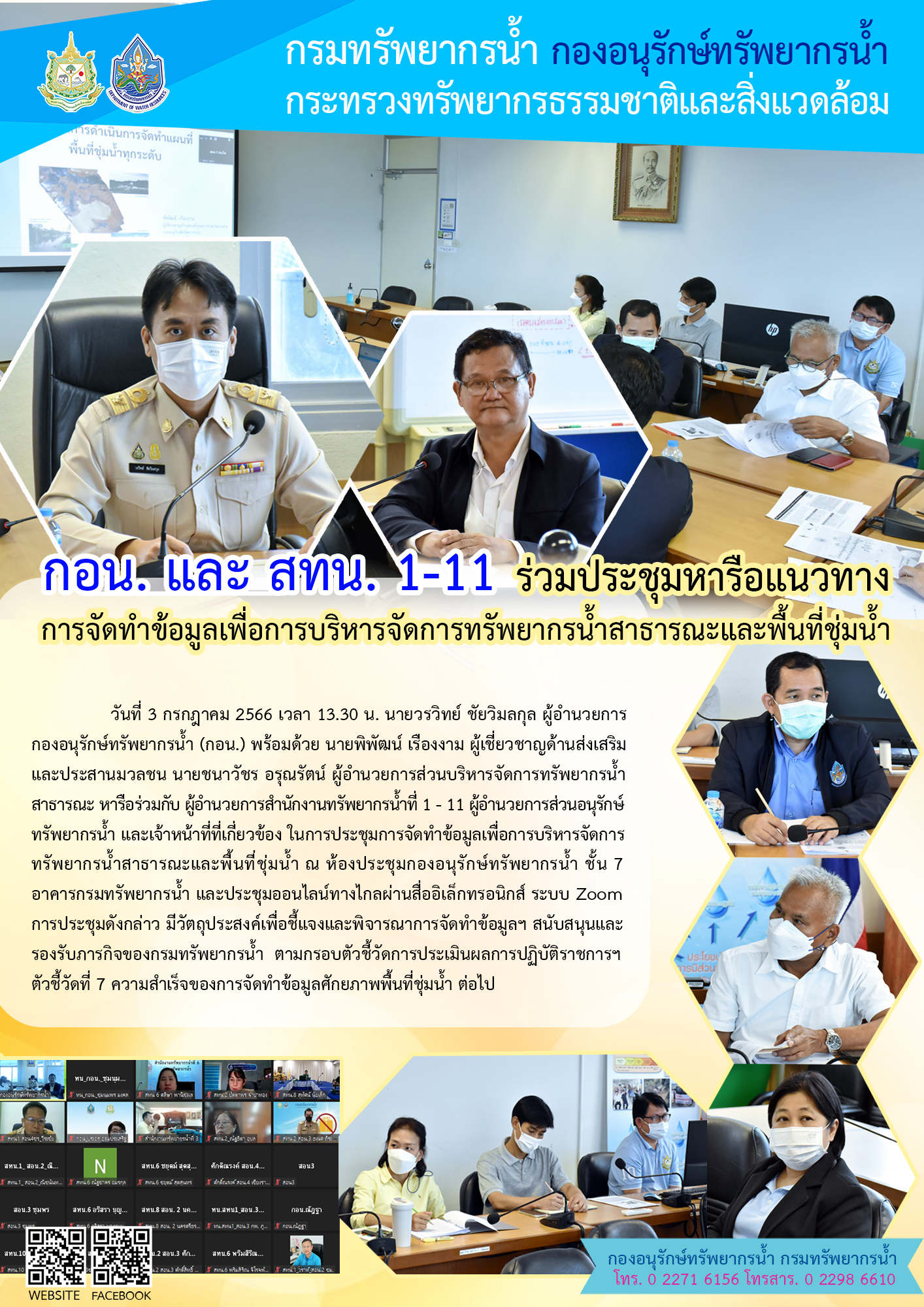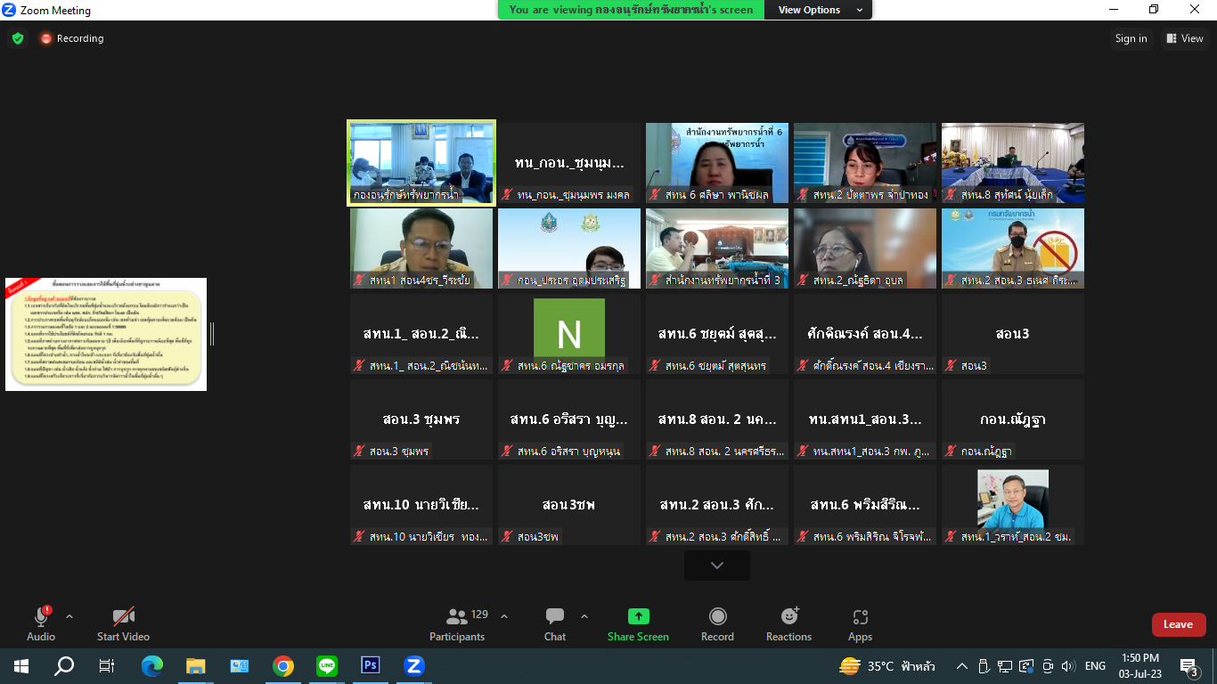 วันที่ 3 กรกฎาคม 2566 เวลา 13.30 น. นายวรวิทย์ ชัยวิมลกุล ผู้อำนวยการกองอนุรักษ์ทรัพยากรน้ำ (กอน.) พร้อมด้วย นายพิพัฒน์ เรืองงาม ผู้เชี่ยวชาญด้านส่งเสริมและประสานมวลชน นายชนาวัชร อรุณรัตน์ ผู้อำนวยการส่วนบริหารจัดการทรัพยากรน้ำสาธารณะ หารือร่วมกับ ผู้อำนวยการสำนักงานทรัพยากรน้ำที่ 1 - 11 ผู้อำนวยการส่วนอนุรักษ์ทรัพยากรน้ำ และเจ้าหน้าที่ที่เกี่ยวข้อง ในการประชุมการจัดทำข้อมูลเพื่อการบริหารจัดการทรัพยากรน้ำสาธารณะและพื้นที่ชุ่มน้ำ