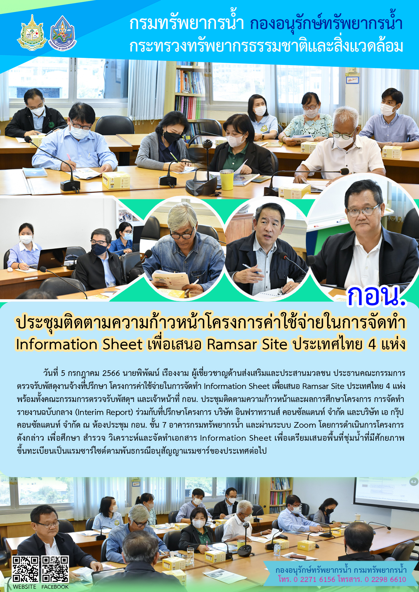 วันที่ 5 กรกฎาคม 2566 นายพิพัฒน์ เรืองงาม ผู้เชี่ยวชาญด้านส่งเสริมและประสานมวลชน ประธานคณะกรรมการตรวจรับพัสดุงานจ้างที่ปรึกษา โครงการค่าใช้จ่ายในการจัดทำ Information Sheet เพื่อเสนอ Ramsar Site ประเทศไทย 4 แห่ง พร้อมทั้งคณะกรรมการตรวจรับพัสดุฯ และเจ้าหน้าที่ กอน. ประชุมติดตามความก้าวหน้าและผลการศึกษาโครงการ การจัดทำรายงานฉบับกลาง (Interim Report) ร่วมกับที่ปรึกษาโครงการ บริษัท อินฟราทรานส์ คอนซัลแตนท์ จำกัด และบริษัท เอ กรุ๊ป คอนซัลแตนท์ จำกัด ณ ห้องประชุม กอน. ชั้น 7 อาคารกรมทรัพยากรน้ำ และผ่านระบบ Zoom