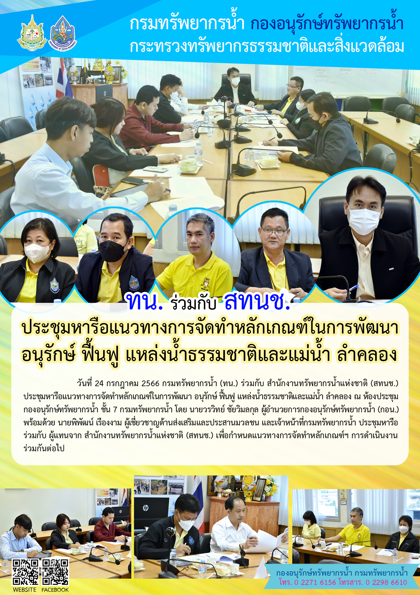 วันที่ 24 กรกฎาคม 2566 กรมทรัพยากรน้ำ (ทน.) ร่วมกับ สำนักงานทรัพยากรน้ำแห่งชาติ (สทนช.) ประชุมหารือแนวทางการจัดทำหลักเกณฑ์ในการพัฒนา อนุรักษ์ ฟื้นฟู แหล่งน้ำธรรมชาติและแม่น้ำ ลำคลอง ณ ห้องประชุมกองอนุรักษ์ทรัพยากรน้ำ ชั้น 7 กรมทรัพยากรน้ำ
