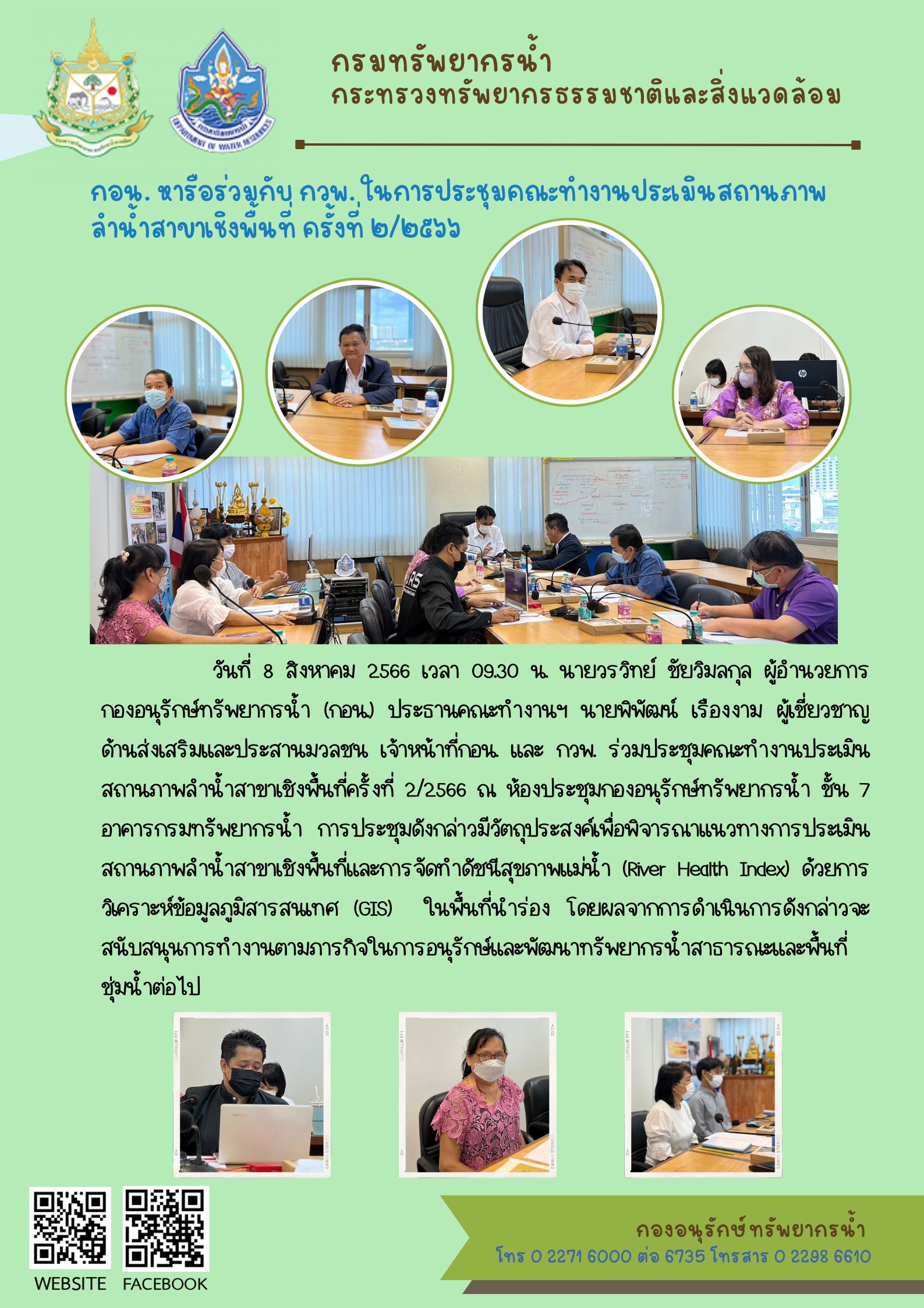 วันที่ 8 สิงหาคม 2566 เวลา 09.30 น. นายวรวิทย์ ชัยวิมลกุล ผู้อำนวยการ กองอนุรักษ์ทรัพยากรน้ำ (กอน.) ประธานคณะทำงานฯ นายพิพัฒน์ เรืองงาม ผู้เชี่ยวชาญ ด้านส่งเสริมและประสานมวลชน เจ้าหน้าที่กอน. และ กวพ. ร่วมประชุมคณะทำงานประเมินสถานภาพลำน้ำสาขาเชิงพื้นที่ครั้งที่ 2/2566 ณ ห้องประชุมกองอนุรักษ์ทรัพยากรน้ำ ชั้น 7 อาคารกรมทรัพยากรน้ำ