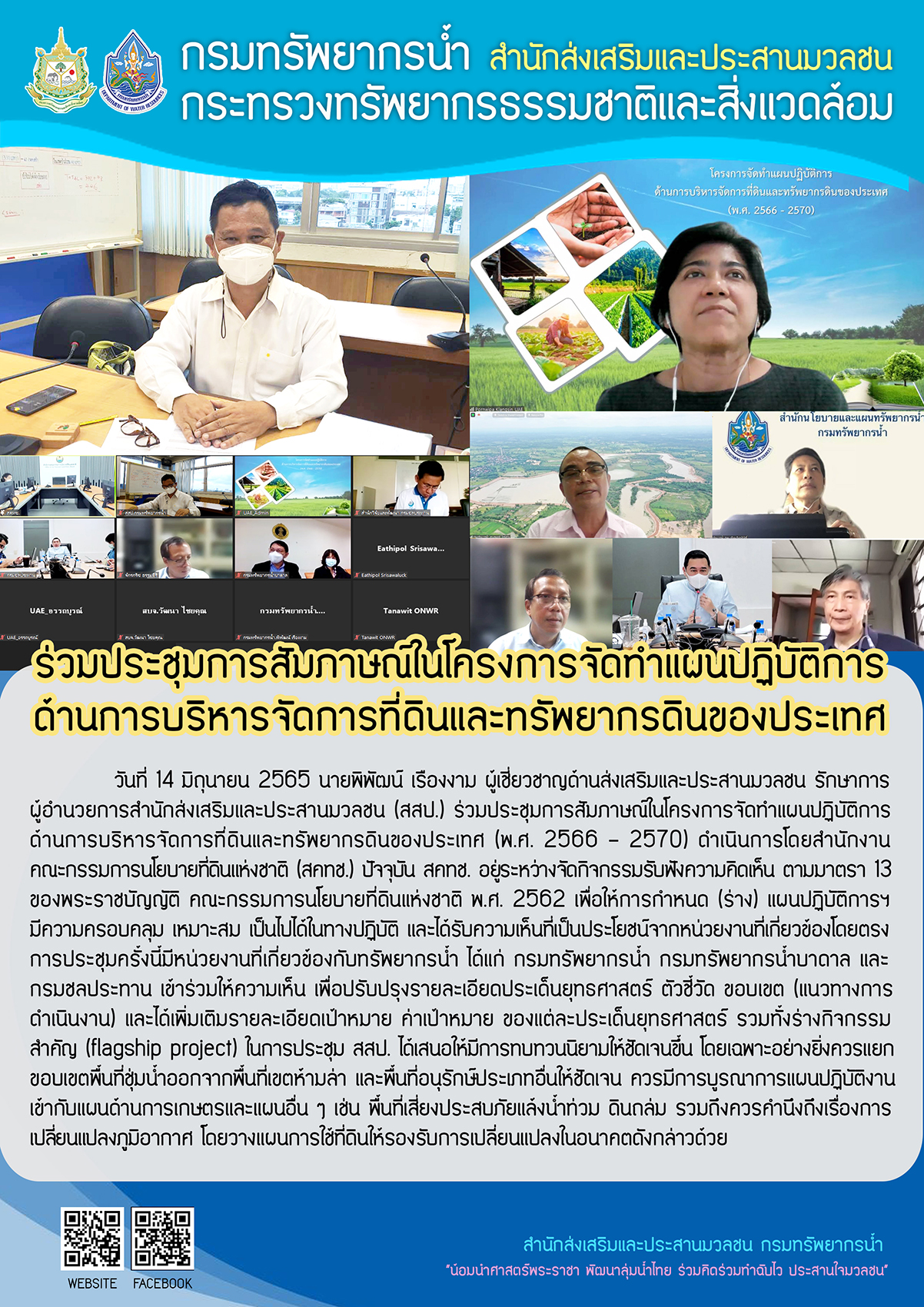 14 มิ.ย. 2565 สสป. ร่วมประชุมการสัมภาษณ์ในโครงการจัดทำแผนปฏิบัติการด้านการบริหารจัดการที่ดินและทรัพยากรดินของประเทศ (พ.ศ. 2566 - 2570)