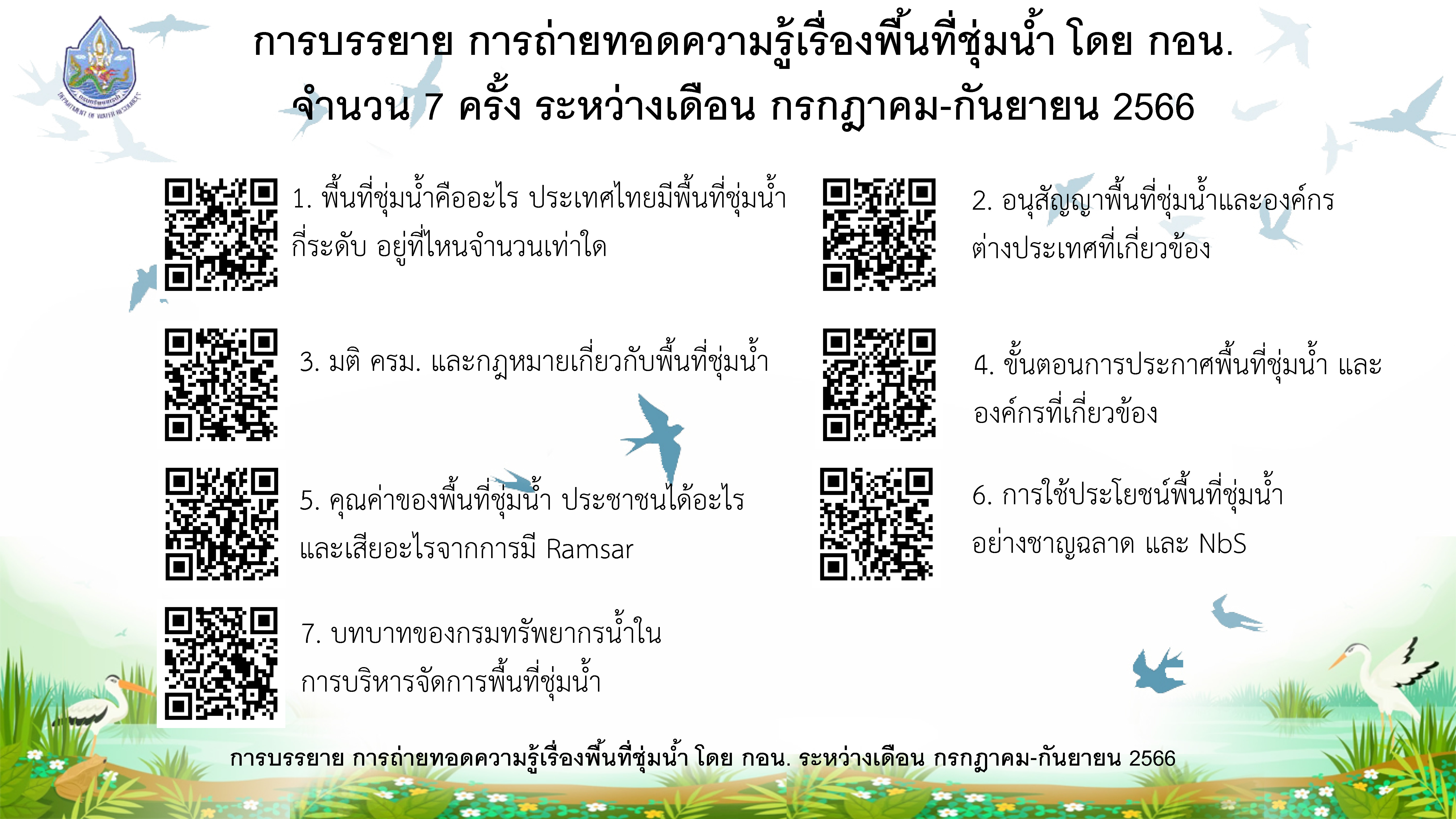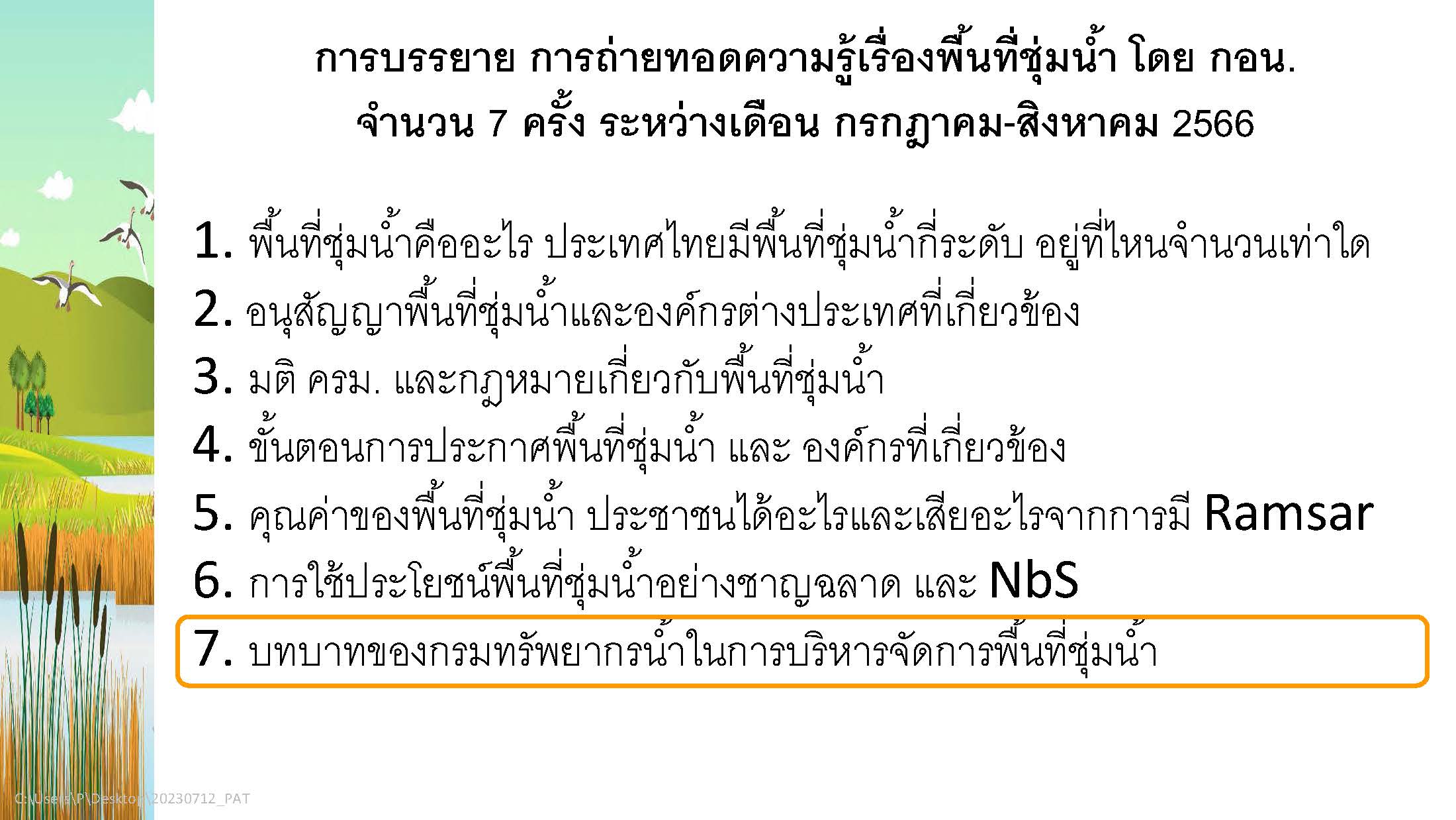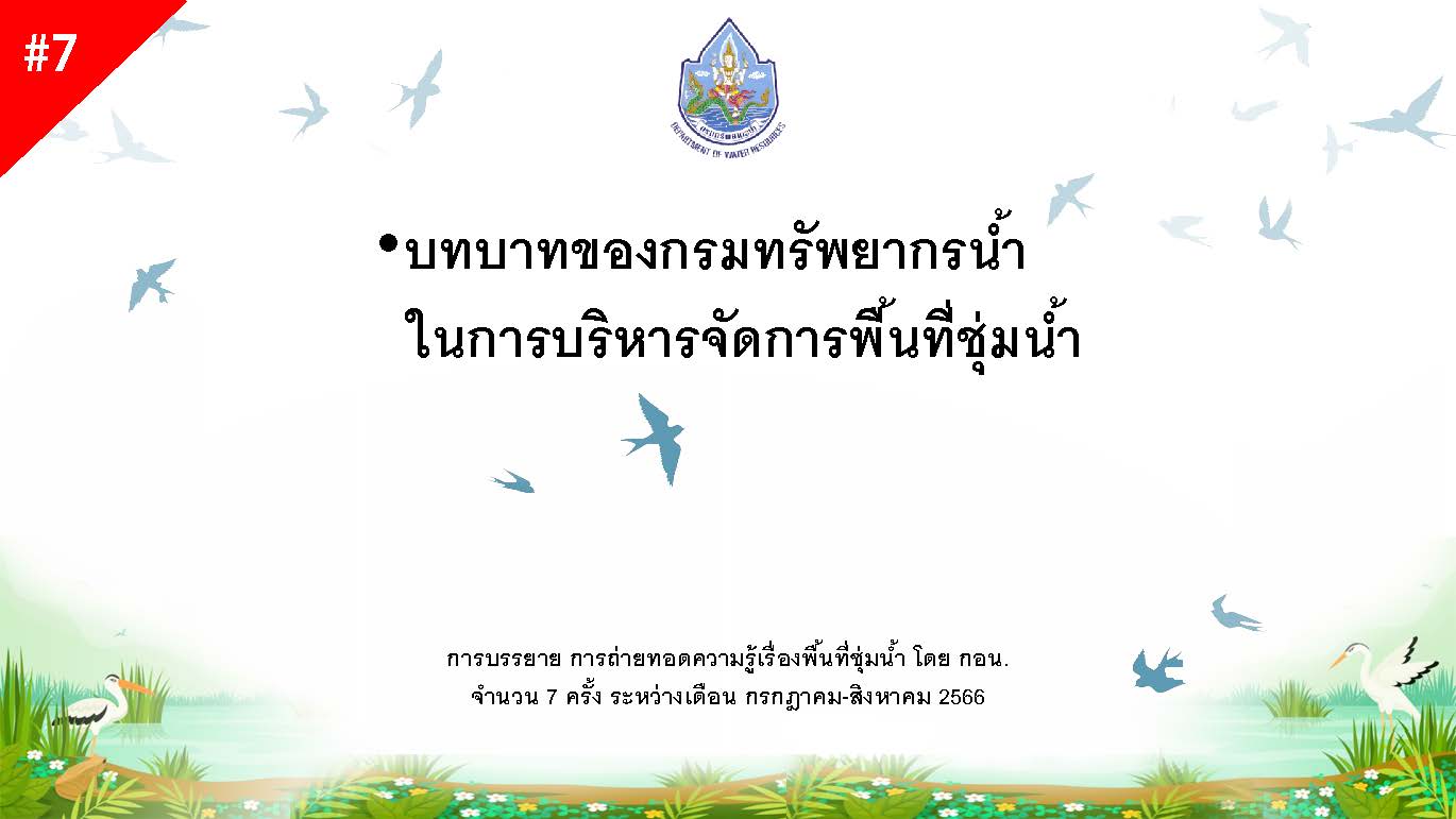 นที่ 4 กันยายน 2566 เวลา 13.30 น. นายพิพัฒน์ เรืองงาม ผู้เชี่ยวชาญด้านส่งเสริมและประสานมวลชน กองอนุรักษ์ทรัพยากรน้ำ (กอน.) เป็นวิทยากรบรรยายให้ความรู้เกี่ยวกับการบริหารจัดการทรัพยากรน้ำและพื้นที่ชุ่มน้ำ ครั้งที่ 7 หัวข้อ “บทบาทของกรมทรัพยากรน้ำในการบริหารจัดการพื้นที่ชุ่มน้ำ” โ