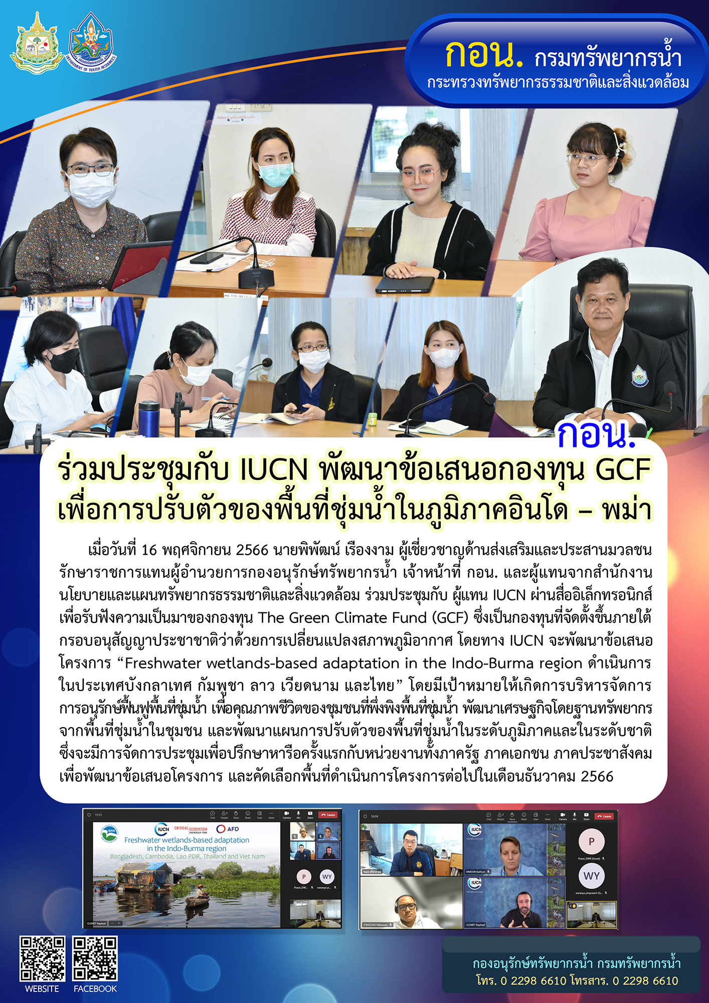 เมื่อวันที่ 16 พฤศจิกายน 2566 นายพิพัฒน์ เรืองงาม ผู้เชี่ยวชาญด้านส่งเสริมและประสานมวลชน รักษาราชการแทนผู้อำนวยการกองอนุรักษ์ทรัพยากรน้ำ เจ้าหน้าที่ กอน. และผู้แทนจากสำนักงานนโยบายและแผนทรัพยากรธรรมชาติและสิ่งแวดล้อม ร่วมประชุมกับ ผู้แทน IUCN ผ่านสื่ออิเล็กทรอนิกส์ เพื่อรับฟังความเป็นมาของกองทุน The Green Climate Fund (GCF)