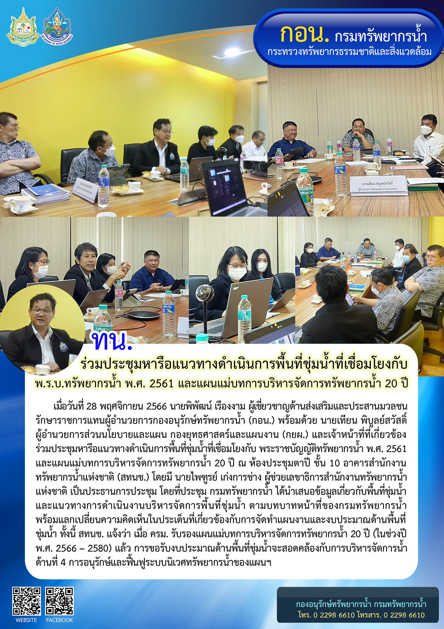วันที่ 28 พฤศจิกายน 2566 นายพิพัฒน์ เรืองงาม ผู้เชี่ยวชาญด้านส่งเสริมและประสานมวลชน รักษาราชการแทนผู้อำนวยการกองอนุรักษ์ทรัพยากรน้ำ (กอน.) พร้อมด้วย นายเทียน พิบูลย์สวัสดิ์ ผู้อำนวยการส่วนนโยบายและแผน กองยุทธศาสตร์และแผนงาน (กยผ.) และเจ้าหน้าที่ที่เกี่ยวข้อง ร่วมประชุมหารือแนวทางดำเนินการพื้นที่ชุ่มน้ำที่เชื่อมโยงกับ พระราชบัญญัติทรัพยากรน้ำ พ.ศ. 2561 และแผนแม่บทการบริหารจัดการทรัพยากรน้ำ 20 ปี ณ ห้องประชุมตาปี ชั้น 10 อาคารสำนักงานทรัพยากรน้ำแห่งชาติ (สทนช.) โดยมี นายไพฑูรย์ เก่งการช่าง ผู้ช่วยเลขาธิการสำนักงานทรัพยากรน้ำแห่งชาติ เป็นประธานการประชุม