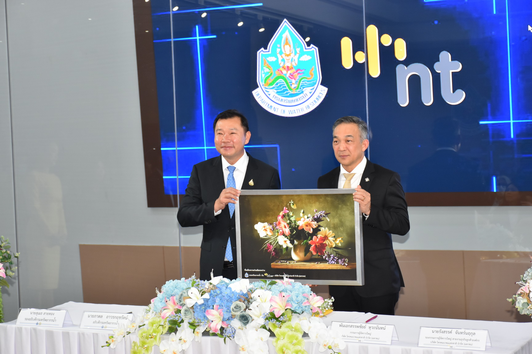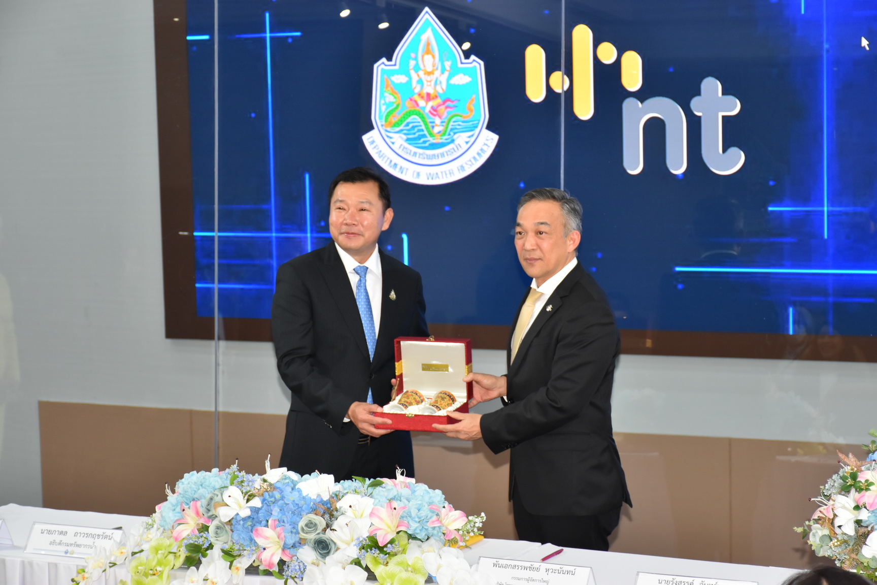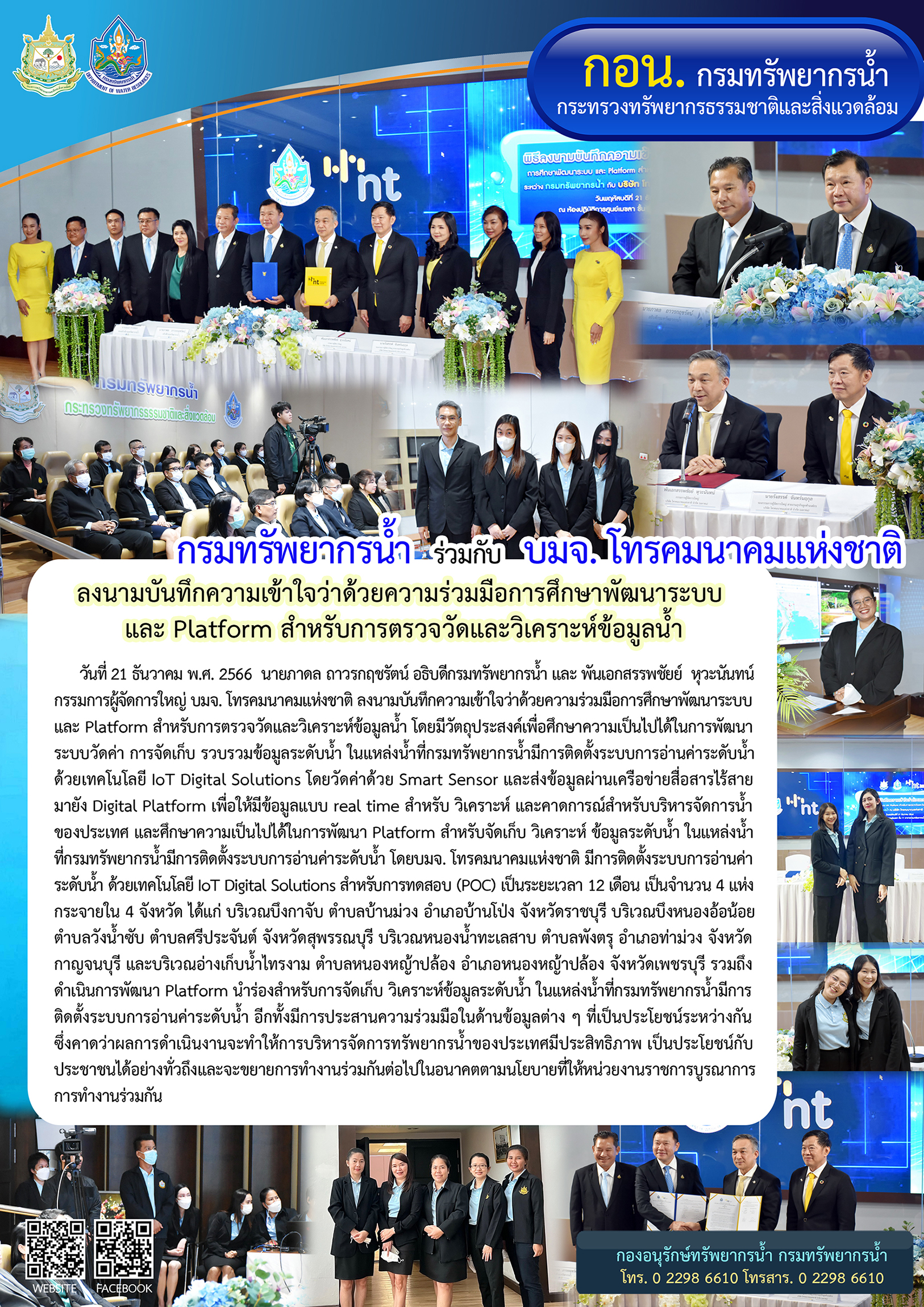 วันที่ 21 ธันวาคม พ.ศ. 2566 นายภาดล ถาวรกฤชรัตน์ อธิบดีกรมทรัพยากรน้ำ และ พันเอกสรรพชัยย์ หุวะนันทน์ กรรมการผู้จัดการใหญ่ บมจ. โทรคมนาคมแห่งชาติ ลงนามบันทึกความเข้าใจว่าด้วยความร่วมมือการศึกษาพัฒนาระบบ และ Platform สำหรับการตรวจวัดและวิเคราะห์ข้อมูลน้ำ ณ ห้องศูนย์เมขลา ชั้น 11 กรมทรัพยากรน้ำ