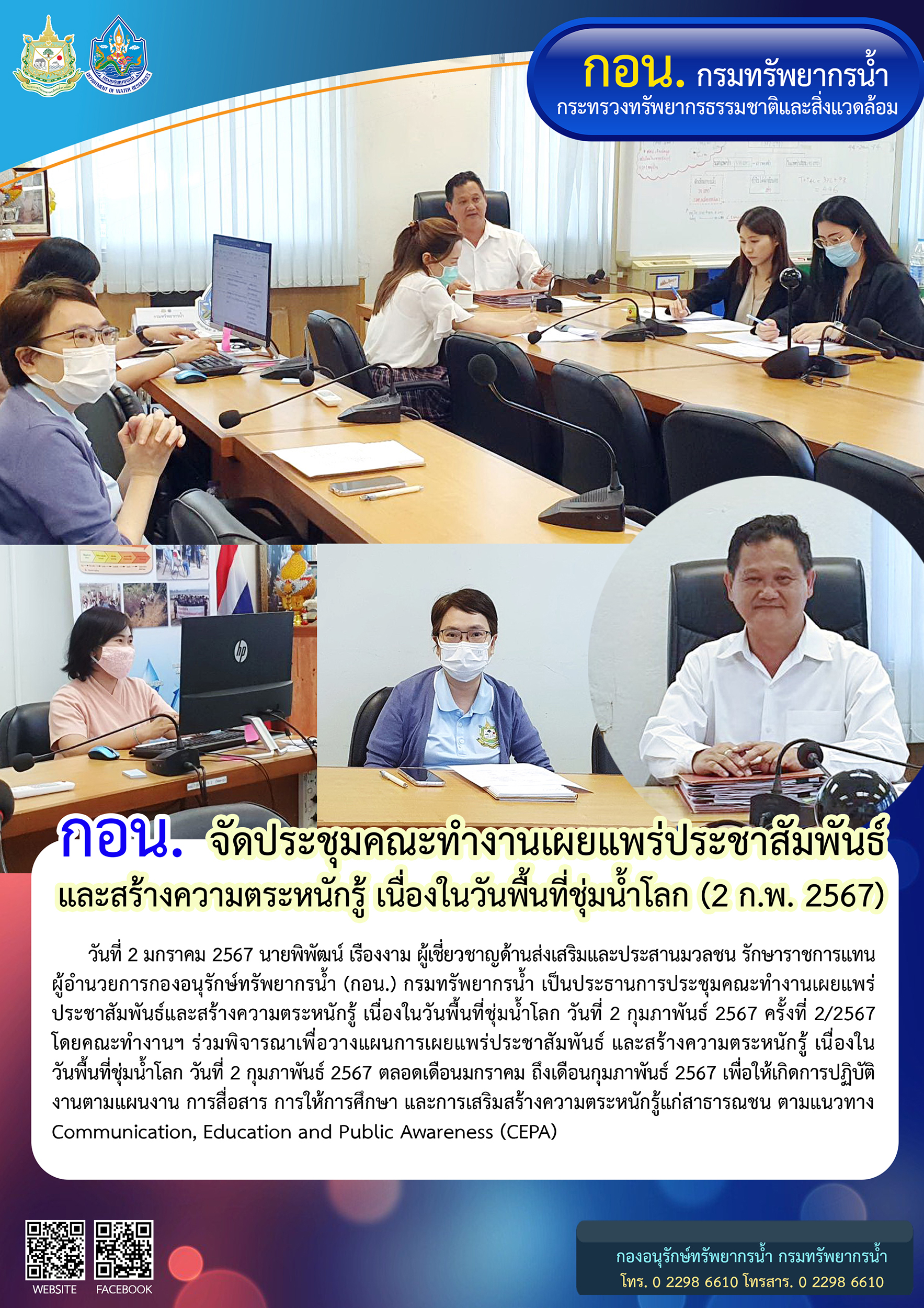 วันที่ 2 มกราคม 2567 นายพิพัฒน์ เรืองงาม ผู้เชี่ยวชาญด้านส่งเสริมและประสานมวลชน รักษาราชการแทนผู้อำนวยการกองอนุรักษ์ทรัพยากรน้ำ (กอน.) กรมทรัพยากรน้ำ เป็นประธานการประชุมคณะทำงานเผยแพร่ประชาสัมพันธ์และสร้างความตระหนักรู้ เนื่องในวันพื้นที่ชุ่มน้ำโลก วันที่ 2 กุมภาพันธ์ 2567 ครั้งที่ 2/2567