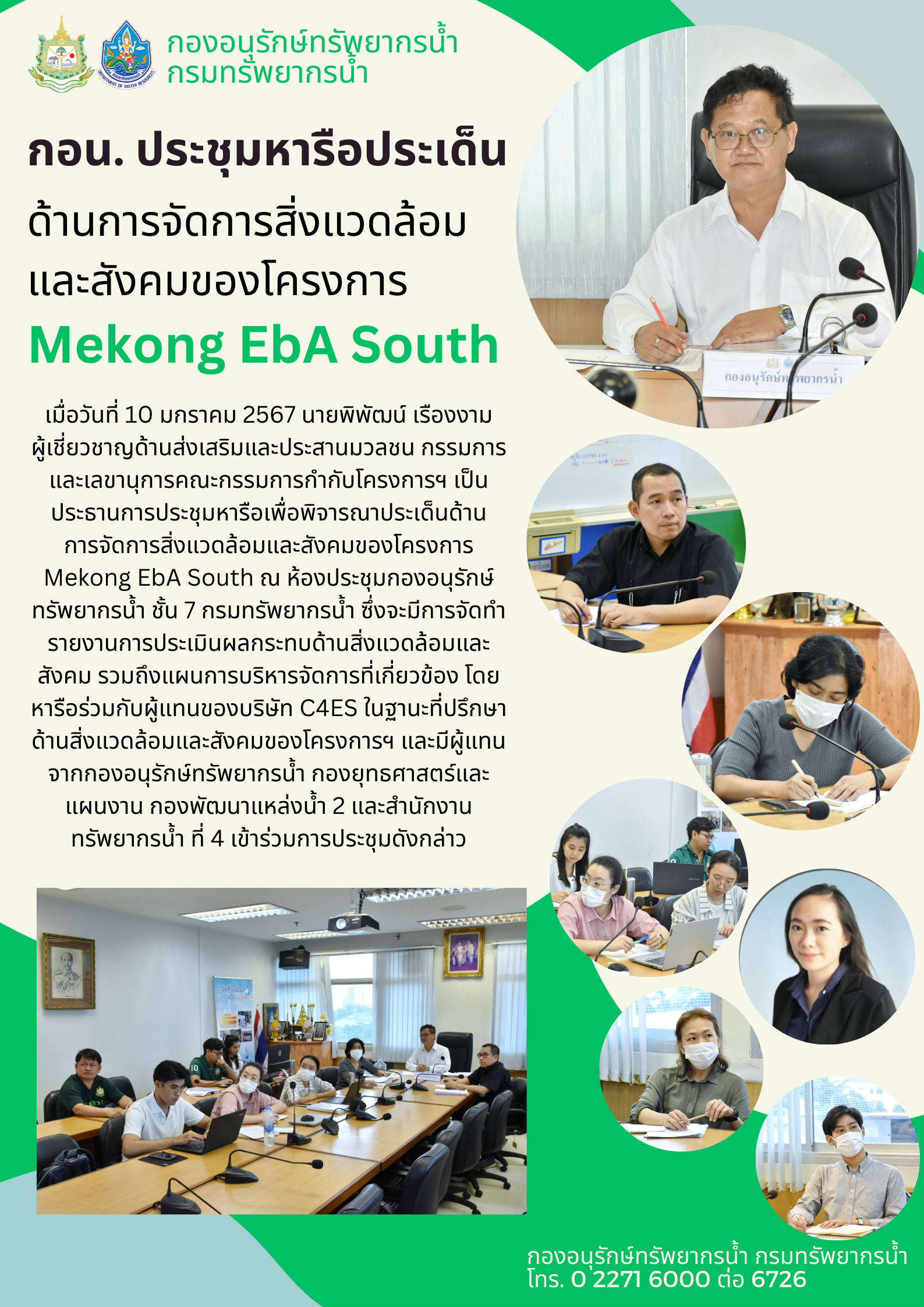 10 มกราคม 2567 นายพิพัฒน์ เรืองงาม ผู้เชี่ยวชาญด้านส่งเสริมและประสานมวลชน กรรมการและเลขานุการคณะกรรมการกำกับโครงการฯ เป็นประธานการประชุมหารือเพื่อพิจารณาประเด็นด้าน การจัดการสิ่งแวดล้อมและสังคมของโครงการ Mekong EbA South ณ ห้องประชุมกองอนุรักษ์ทรัพยากรน้ำ ชั้น 7 กรมทรัพยากรน้ำ