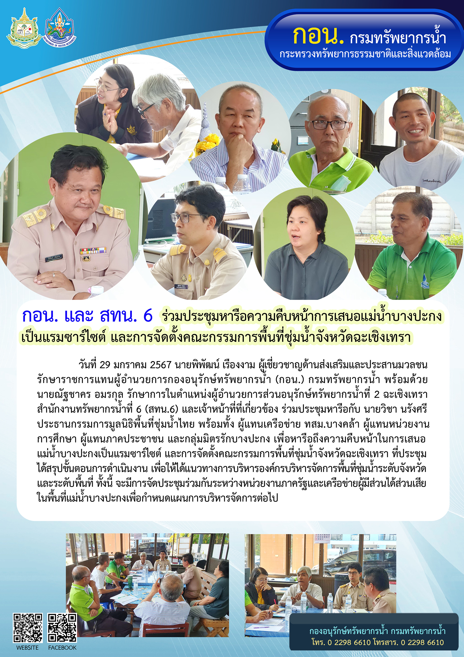 วันที่ 29 มกราคม 2567 นายพิพัฒน์ เรืองงาม ผู้เชี่ยวชาญด้านส่งเสริมและประสานมวลชน รักษาราชการแทนผู้อำนวยการกองอนุรักษ์ทรัพยากรน้ำ (กอน.) กรมทรัพยากรน้ำ พร้อมด้วย นายณัฐชาคร อมรกุล รักษาการในตำแหน่งผู้อำนวยการส่วนอนุรักษ์ทรัพยากรน้ำที่ 2 ฉะเชิงเทรา สำนักงานทรัพยากรน้ำที่ 6 (สทน.6) และเจ้าหน้าที่ที่เกี่ยวข้อง ร่วมประชุมหารือกับ นายวิชา นรังศรี ประธานกรรมการมูลนิธิพื้นที่ชุ่มน้ำไทย พร้อมทั้ง ผู้แทนเครือข่าย ทสม.บางคล้า ผู้แทนหน่วยงานการศึกษา ผู้แทนภาคประชาชน และกลุ่มมิตรรักบางปะกง เพื่อหารือถึงความคืบหน้าในการเสนอแม่น้ำบางปะกงเป็นแรมซาร์ไซต์ และการจัดตั้งคณะกรรมการพื้นที่ชุ่มน้ำจังหวัดฉะเชิงเทรา