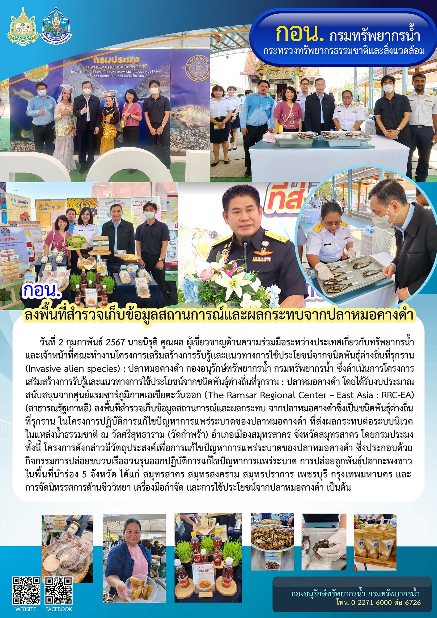 วันที่ 2 กุมภาพันธ์ 2567 นายนิรุติ คูณผล ผู้เชี่ยวชาญด้านความร่วมมือระหว่างประเทศเกี่ยวกับทรัพยากรน้ำ และเจ้าหน้าที่คณะทำงานโครงการเสริมสร้างการรับรู้และแนวทางการใช้ประโยชน์จากชนิดพันธุ์ต่างถิ่นที่รุกราน (Invasive alien species) : ปลาหมอคางดำ กองอนุรักษ์ทรัพยากรน้ำ กรมทรัพยากรน้ำ ซึ่งดำเนินการโครงการเสริมสร้างการรับรู้และแนวทางการใช้ประโยชน์จากชนิดพันธุ์ต่างถิ่นที่รุกราน : ปลาหมอคางดำ โดยได้รับงบประมาณสนับสนุนจากศูนย์แรมซาร์ภูมิภาคเอเชียตะวันออก (The Ramsar Regional Center – East Asia : RRC-EA) (สาธารณรัฐเกาหลี) ลงพื้นที่สำรวจเก็บข้อมูลสถานการณ์และผลกระทบ จากปลาหมอคางดำซึ่งเป็นชนิดพันธุ์ต่างถิ่นที่รุกราน ในโครงการปฏิบัติการแก้ไขปัญหาการแพร่ระบาดของปลาหมอคางดำ ที่ส่งผลกระทบต่อระบบนิเวศในแหล่งน้ำธรรมชาติ ณ วัดศรีสุทธาราม (วัดกำพร้า) อำเภอเมืองสมุทรสาคร จังหวัดสมุทรสาคร โดยกรมประมง