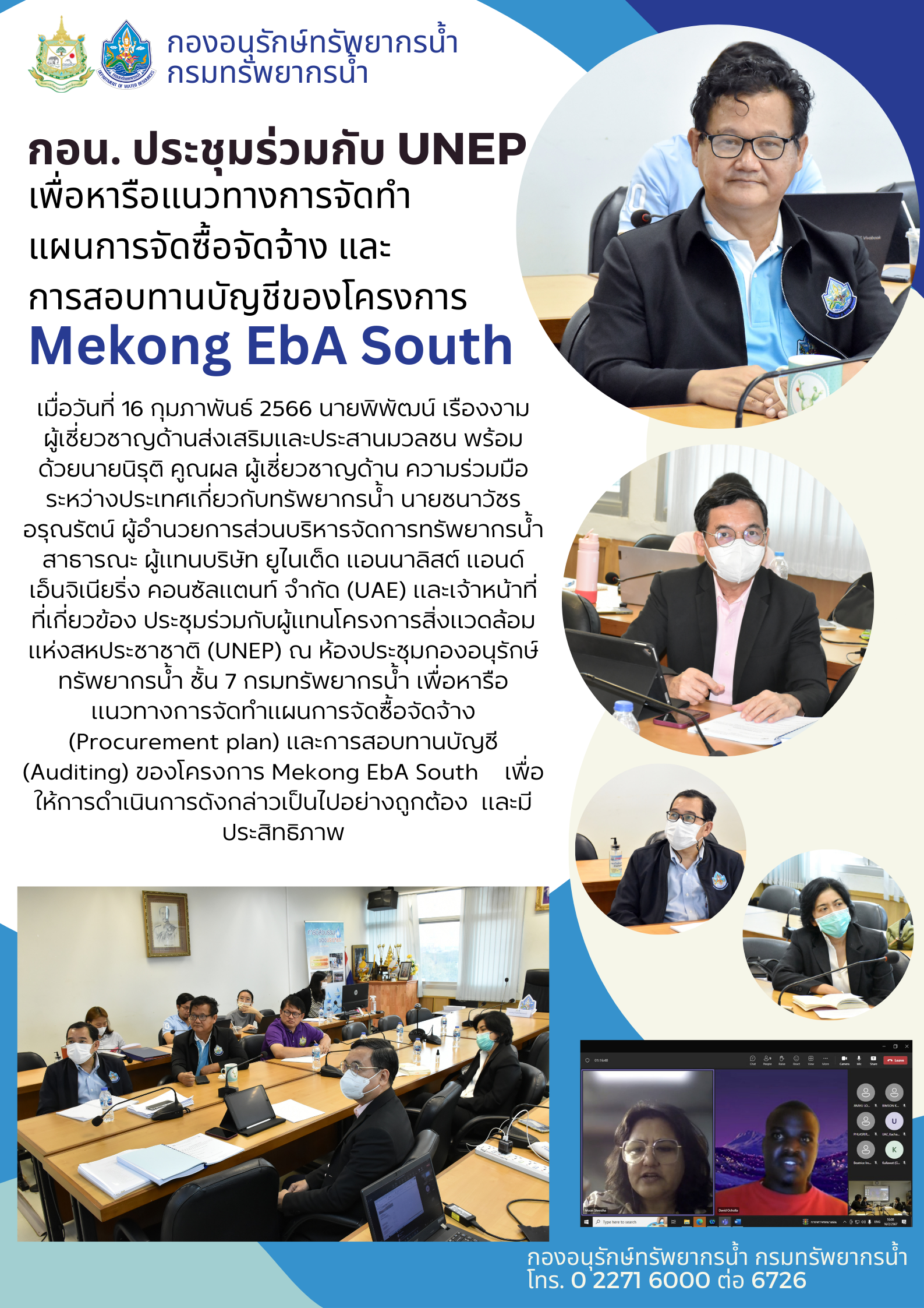 วันที่ 16 กุมภาพันธ์ 2566 นายพิพัฒน์ เรืองงาม ผู้เชี่ยวชาญด้านส่งเสริมและประสานมวลชน พร้อมด้วยนายนิรุติ คูณผล ผู้เชี่ยวชาญด้าน ความร่วมมือระหว่างประเทศเกี่ยวกับทรัพยากรน้ำ นายชนาวัชร อรุณรัตน์ ผู้อำนวยการส่วนบริหารจัดการทรัพยากรน้ำสาธารณะ ผู้แทนบริษัท ยูไนเต็ด แอนนาลิสต์ แอนด์ เอ็นจิเนียริ่ง คอนซัลแตนท์ จำกัด (UAE) และเจ้าหน้าที่ที่เกี่ยวข้อง ประชุมร่วมกับผู้แทนโครงการสิ่งแวดล้อมแห่งสหประชาชาติ (UNEP) ณ ห้องประชุมกองอนุรักษ์ทรัพยากรน้ำ ชั้น 7 กรมทรัพยากรน้ำ เพื่อหารือแนวทางการจัดทำแผนการจัดซื้อจัดจ้าง (Procurement plan) และการสอบทานบัญชี (Auditing) ของโครงการ Mekong EbA South