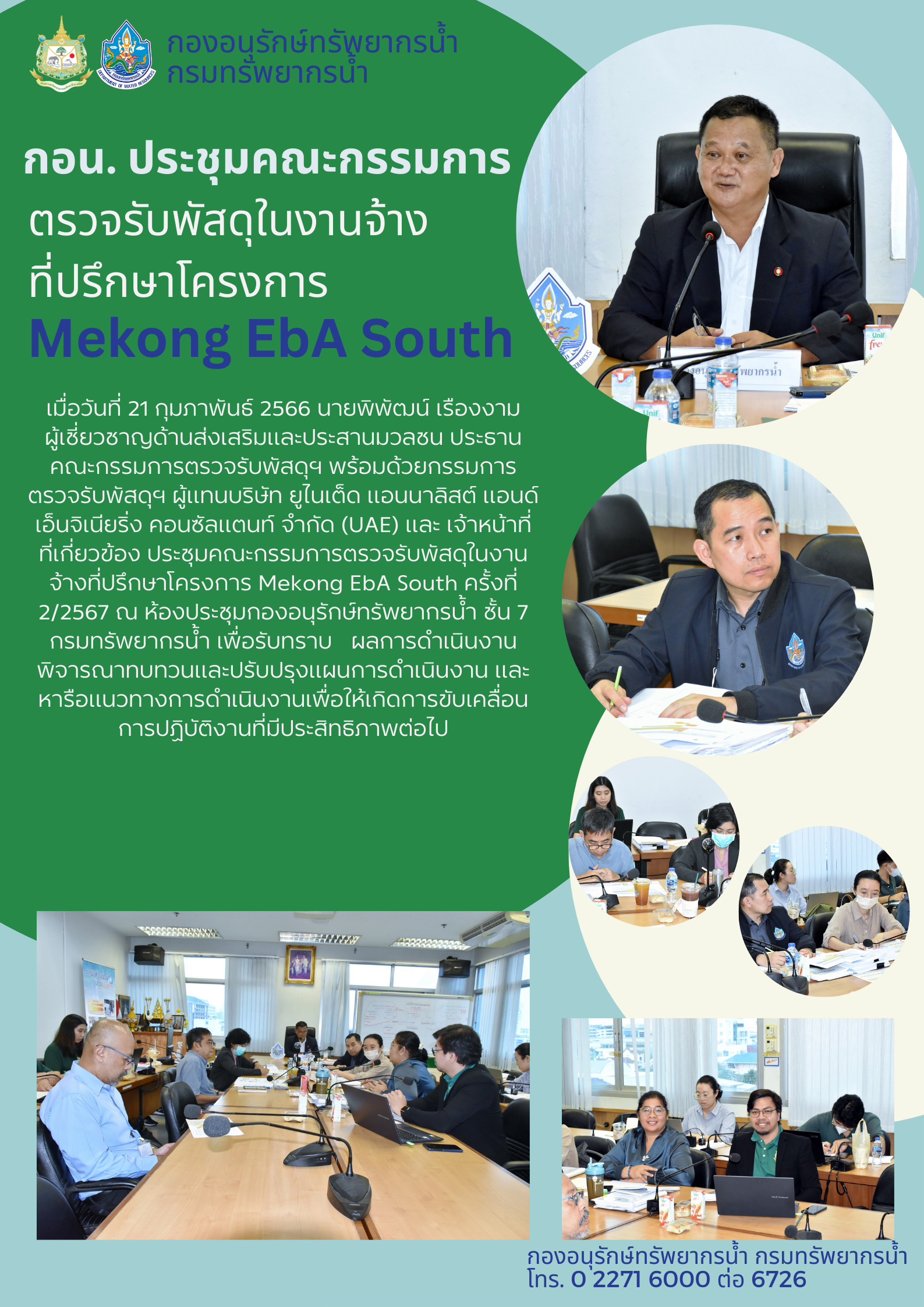 เมื่อวันที่ 21 กุมภาพันธ์ 2566 นายพิพัฒน์ เรืองงาม ผู้เชี่ยวชาญด้านส่งเสริมและประสานมวลชน ประธาน คณะกรรมการตรวจรับพัสดุฯ พร้อมด้วยกรรมการตรวจรับพัสดุฯ ผู้แทนบริษัท ยูไนเต็ด แอนนาลิสต์ แอนด์ เอ็นจิเนียริ่ง คอนซัลแตนท์ จำกัด (UAE) และ เจ้าหน้าที่ที่เกี่ยวข้อง ประชุมคณะกรรมการตรวจรับพัสดุในงานจ้างที่ปรึกษาโครงการ Mekong EbA South ครั้งที่ 2/2567 ณ ห้องประชุมกองอนุรักษ์ทรัพยากรน้ำ ชั้น 7 กรมทรัพยากรน้ำ