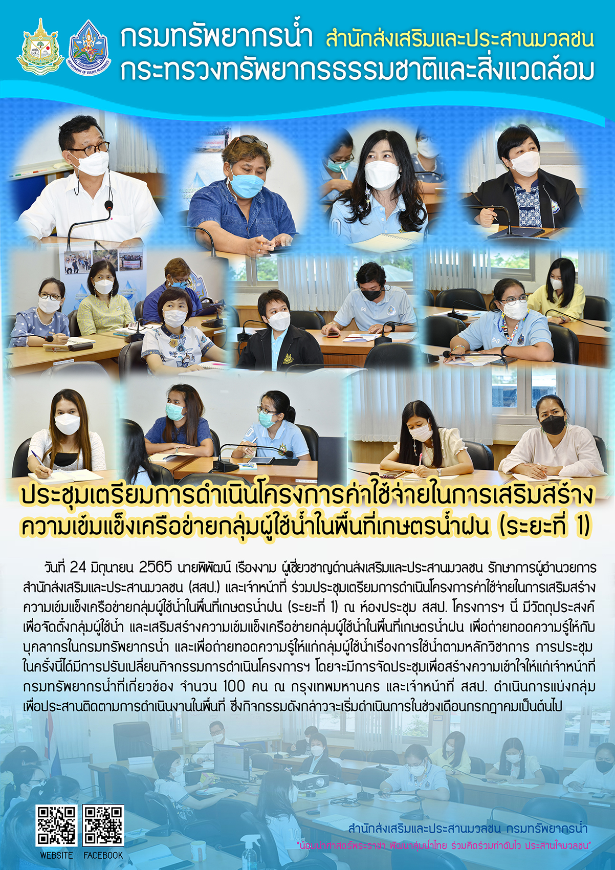 24 มิ.ย. 2565 ประชุมเตรียมการดำเนินโครงการค่าใช้จ่ายในการเสริมสร้างความเข้มแข็งเครือข่ายกลุ่มผู้ใช้น้ำในพื้นที่เกษตรน้ำฝน (ระยะที่ 1) ณ ห้องประชุม สสป.