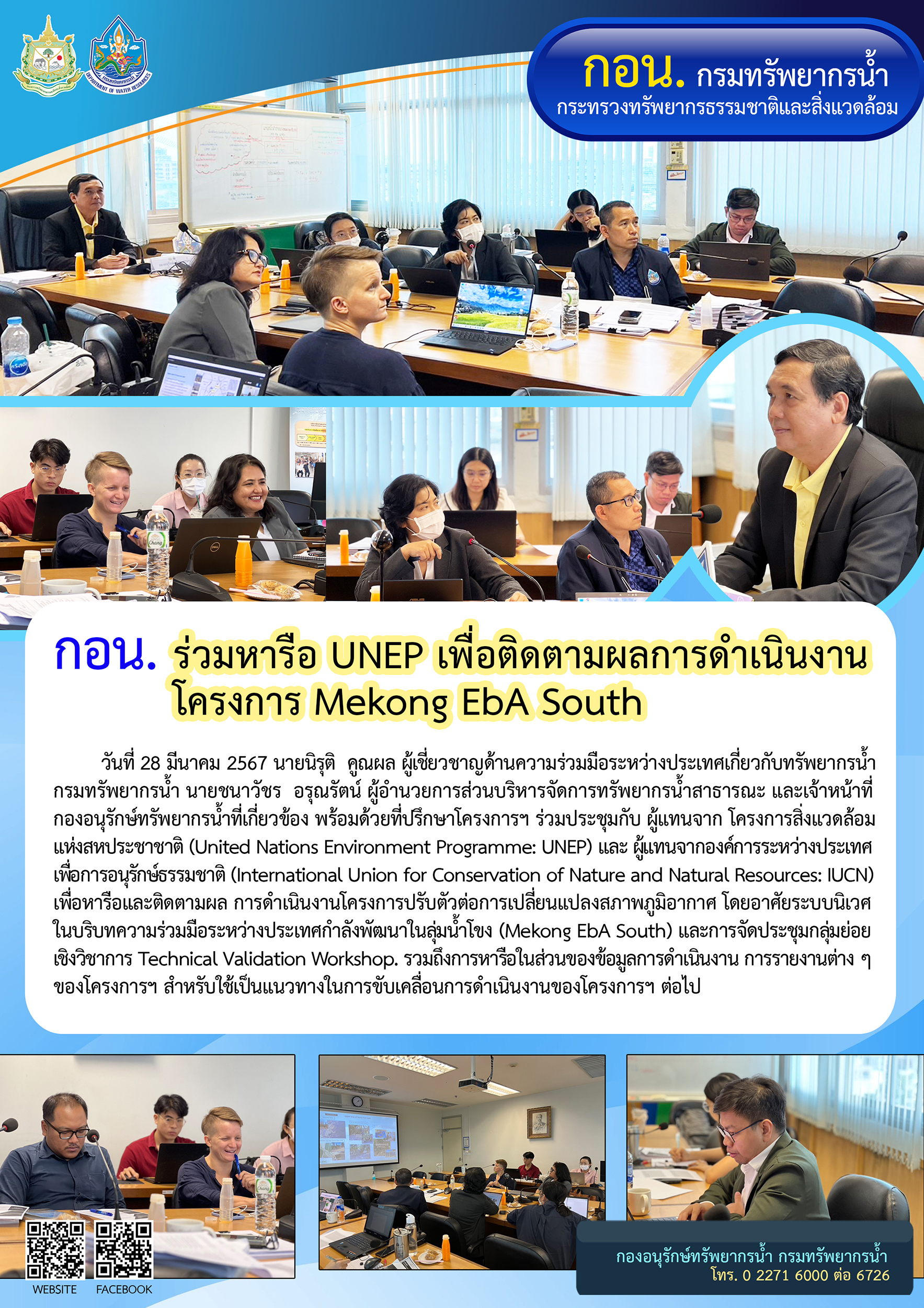 วันที่ 28 มีนาคม 2567 นายนิรุติ คูณผล ผู้เชี่ยวชาญด้านความร่วมมือระหว่างประเทศเกี่ยวกับทรัพยากรน้ำ กรมทรัพยากรน้ำ นายชนาวัชร อรุณรัตน์ ผู้อำนวยการส่วนบริหารจัดการทรัพยากรน้ำสาธารณะ และเจ้าหน้าที่กองอนุรักษ์ทรัพยากรน้ำที่เกี่ยวข้อง พร้อมด้วยที่ปรึกษาโครงการฯ ร่วมประชุมกับ ผู้แทนจาก โครงการสิ่งแวดล้อมแห่งสหประชาชาติ (United Nations Environment Programme: UNEP) และ ผู้แทนจากองค์การระหว่างประเทศเพื่อการอนุรักษ์ธรรมชาติ (International Union for Conservation of Nature and Natural Resources: IUCN) เพื่อหารือและติดตามผล การดำเนินงานโครงการปรับตัวต่อการเปลี่ยนแปลงสภาพภูมิอากาศ โดยอาศัยระบบนิเวศในบริบทความร่วมมือระหว่างประเทศกำลังพัฒนาในลุ่มน้ำโขง (Mekong EbA South)