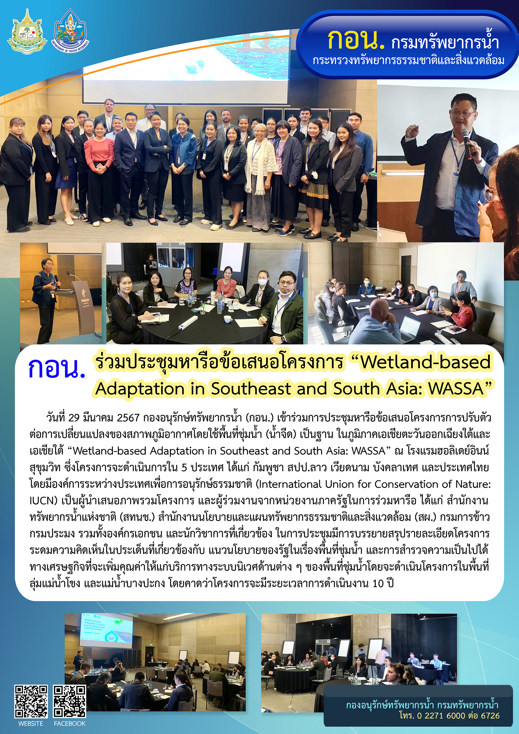 วันที่ 29 มีนาคม 2567 กองกนุรักษ์ทรัพยากรน้ำ (กอน.) เข้าร่วมการประชุมหารือข้อเสนอโครงการการปรับตัวต่อการเปลี่ยนแปลงของสภาพภูมิอากาศโดยใช้พื้นที่ชุ่มน้ำ (น้ำจืด) เป็นฐาน ในภูมิภาคเอเชียตะวันออกเฉียงใต้และเอเชียใต้ “Wetland-based Adaptation in Southeast and South Asia: WASSA” ณ โรงแรมฮอลิเดย์อินน์ สุขุมวิท ซึ่งโครงการจะดำเนินการใน 5 ประเทศ ได้แก่ กัมพูชา สปป.ลาว เวียดนาม บังคลาเทศ และประเทศไทย โดยมีองค์การระหว่างประเทศเพื่อการอนุรักษ์ธรรมชาติ (International Union for Conservation of Nature: IUCN) เป็นผู้นำเสนอภาพรวมโครงการ และผู้ร่วมงานจากหน่วยงานภาครัฐในการร่วมหารือ ได้แก่ สำนักงานทรัพยากรน้ำแห่งชาติ (สทนช.) สำนักงานนโยบายและแผนทรัพยากรธรรมชาติและสิ่งแวดล้อม (สผ.) กรมการข้าว กรมประมง รวมทั้งองค์กรเอกชน และนักวิชาการที่เกี่ยวข้อง