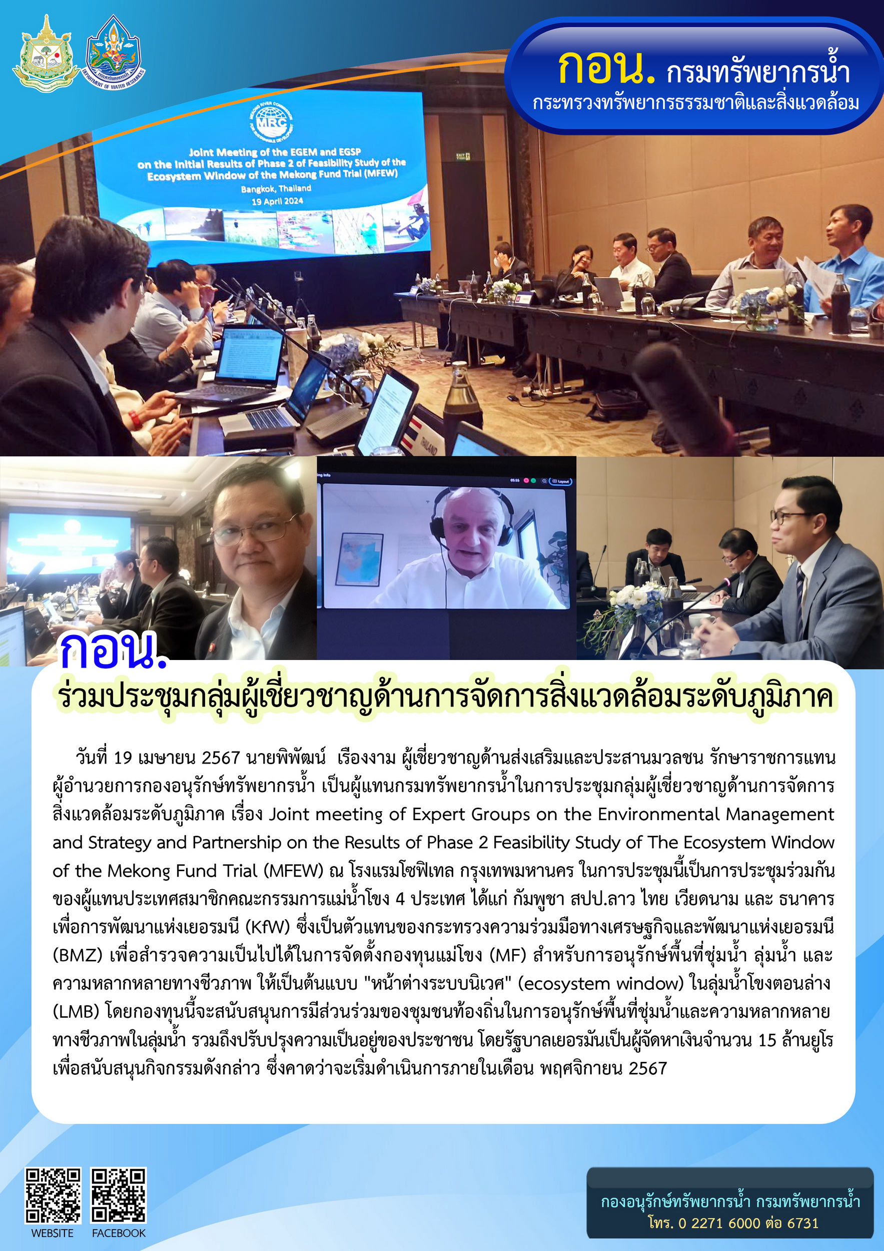 วันที่ 19 เมษายน 2567 นายพิพัฒน์ เรืองงาม ผู้เชี่ยวชาญด้านส่งเสริมและประสานมวลชน รักษาราชการแทนผู้อำนวยการกองอนุรักษ์ทรัพยากรน้ำ เป็นผู้แทนกรมทรัพยากรน้ำในการประชุมกลุ่มผู้เชี่ยวชาญด้านการจัดการสิ่งแวดล้อมระดับภูมิภาค เรื่อง Joint meeting of Expert Groups on the Environmental Management and Strategy and Partnership on the Results of Phase 2 Feasibility Study of The Ecosystem Window of the Mekong Fund Trial (MFEW) ณ โรงแรมโซฟิเทล กรุงเทพมหานคร