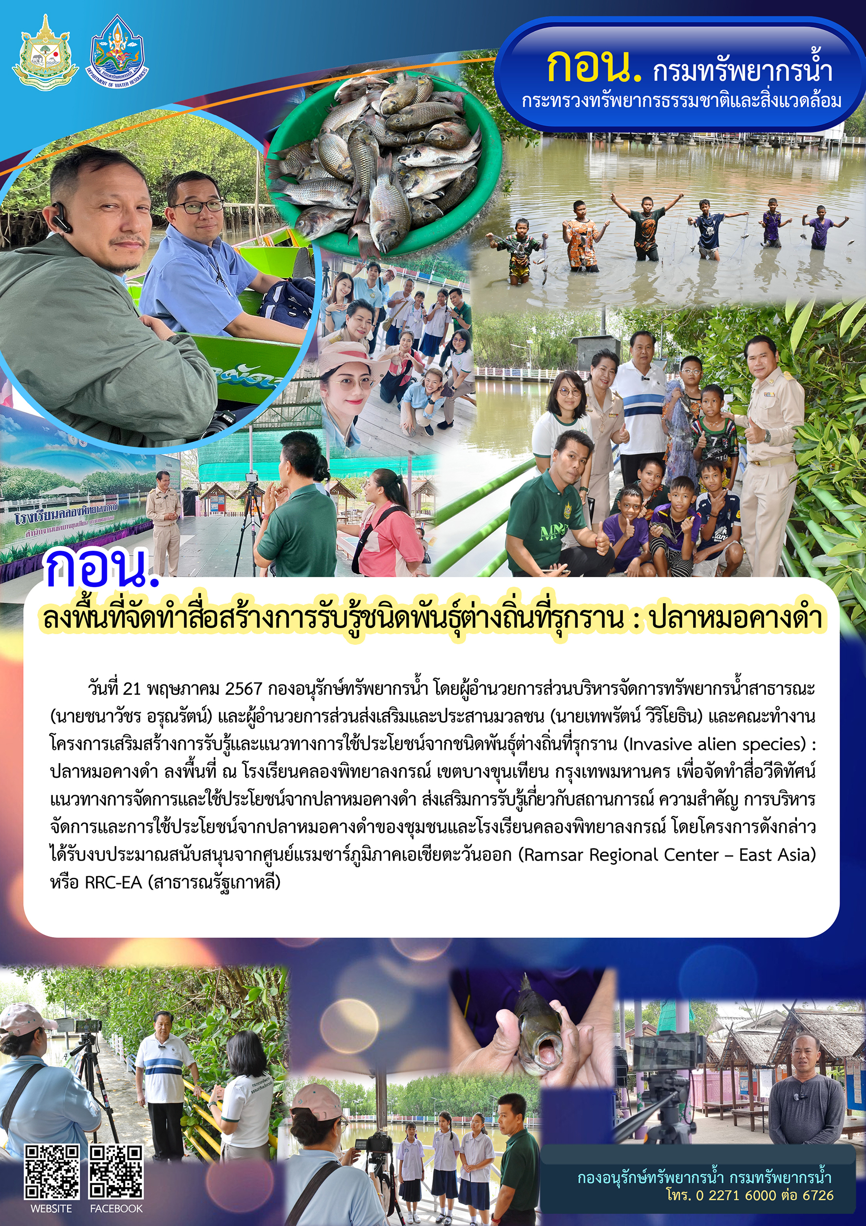 วันที่ 21 พฤษภาคม 2567 กองอนุรักษ์ทรัพยากรน้ำ โดย ผู้อำนวยการส่วนบริหารจัดการทรัพยากรน้ำสาธารณะ (นายชนาวัชร อรุณรัตน์) และผู้อำนวยการส่วนส่งเสริมและประสานมวลชน (นายเทพรัตน์ วิริโยธิน) และคณะทำงานโครงการเสริมสร้างการรับรู้และแนวทางการใช้ประโยชน์จากชนิดพันธุ์ต่างถิ่นที่รุกราน (Invasive alien species) : ปลาหมอคางดำ ลงพื้นที่ ณ โรงเรียนคลองพิทยาลงกรณ์ เขตบางขุนเทียน กรุงเทพมหานคร เพื่อจัดทำสื่อวีดิทัศน์แนวทางการจัดการและใช้ประโยชน์จากปลาหมอคางดำ ส่งเสริมการรับรู้เกี่ยวกับสถานการณ์ ความสำคัญ การบริหารจัดการและการใช้ประโยชน์จากปลาหมอคางดำของชุมชนละโรงเรียนคลองพิทยาลงกรณ์ โดยโดรงการดังกล่าวได้รับงบประมาณสนับสนุนจากศูนย์แรมซาร์ภูมิภาคเอเชียตะวันออก (Ramsar Regional Center – East Asia) หรือ RRC-EA (สาธารณรัฐเกาหลี)