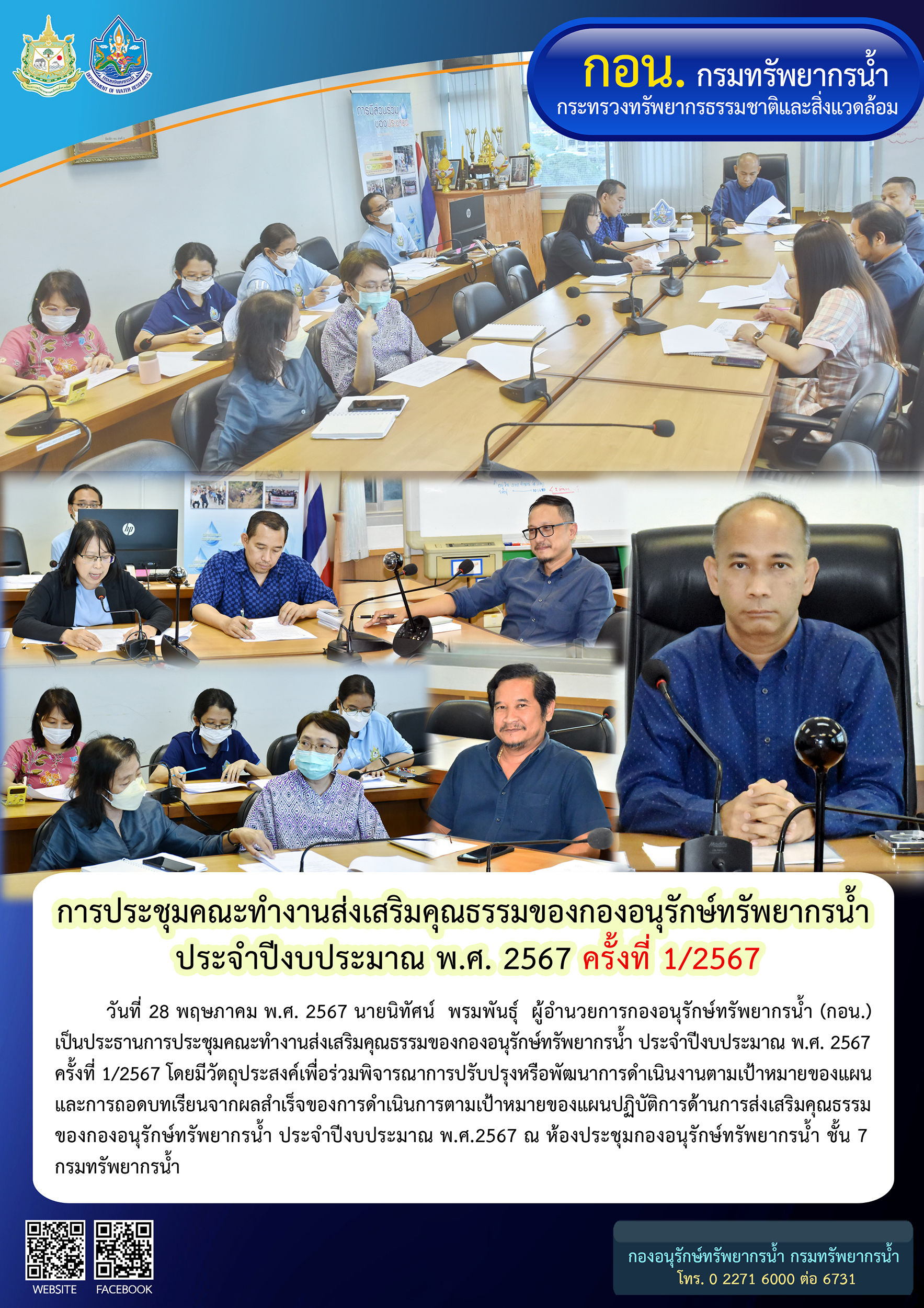 วันที่ 28 พฤษภาคม พ.ศ. 2567 นายนิทัศน์ พรมพันธุ์ ผู้อำนวยการกองอนุรักษ์ทรัพยากรน้ำ เป็นประธานการประชุมคณะทำงานส่งเสริมคุณธรรมของกองอนุรักษ์ทรัพยากรน้ำ ประจำปีงบประมาณ พ.ศ. 2567 ครั้งที่ 1/2567 โดยมีวัตถุประสงค์เพื่อร่วมพิจารณาการปรับปรุงหรือพัฒนาการดำเนินงานตามเป้าหมายของแผน และการถอดบทเรียนจากผลสำเร็จของการดำเนินการตามเป้าหมายของแผนปฏิบัติการด้านการส่งเสริมคุณธรรมของกองอนุรักษ์ทรัพยากรน้ำ ประจำปีงบประมาณ พ.ศ.2567 ณ ห้องประชุมกองอนุรักษ์ทรัพยากรน้ำ ชั้น 7 กรมทรัพยากรน้ำ