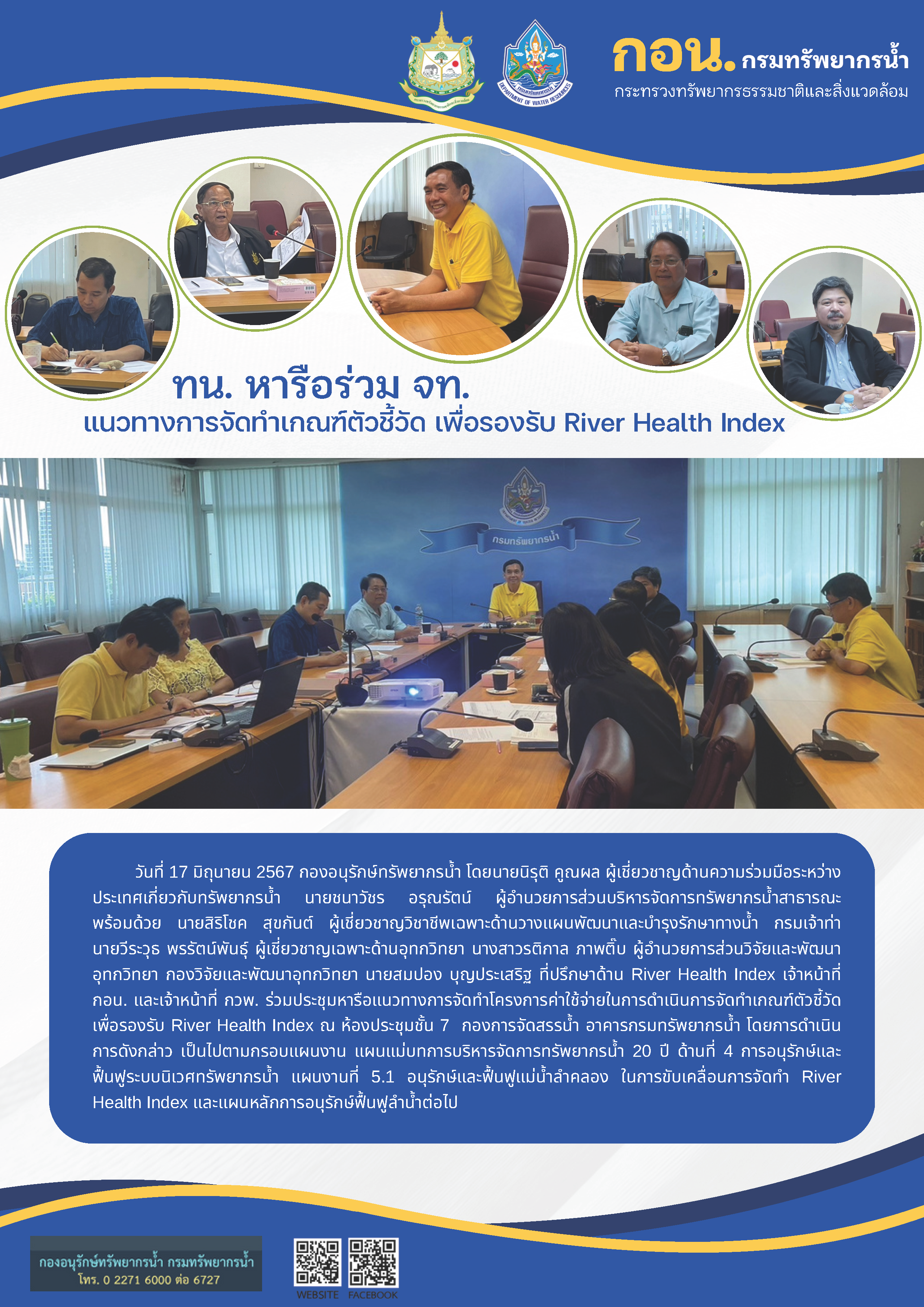 วันที่ 17 มิถุนายน 2567 กองอนุรักษ์ทรัพยากรน้ำ โดยนายนิรุติ คูณผล ผู้เชี่ยวชาญด้านความร่วมมือระหว่างประเทศเกี่ยวกับทรัพยากรน้ำ นายชนาวัชร อรุณรัตน์ ผู้อำนวยการส่วนบริหารจัดการทรัพยากรน้ำสาธารณะ พร้อมด้วย นายสิริโชค สุขกันต์ ผู้เชี่ยวชาญวิชาชีพเฉพาะด้านวางแผนพัฒนาและบำรุงรักษาทางน้ำ กรมเจ้าท่า นายวีระวุธ พรรัตน์พันธุ์ ผู้เชี่ยวชาญเฉพาะด้านอุทกวิทยา นางสาวรติกาล ภาพติ๊บ ผู้อำนวยการส่วนวิจัยและพัฒนาอุทกวิทยา กองวิจัยและพัฒนาอุทกวิทยา นายสมปอง บุญประเสริฐ ที่ปรึกษาด้าน River Health Index เจ้าหน้าที่ กอน. และเจ้าหน้าที่ กวพ. ร่วมประชุมหารือแนวทางการจัดทำโครงการค่าใช้จ่ายในการดำเนินการจัดทำเกณฑ์ตัวชี้วัด เพื่อรองรับ River Health Index ณ ห้องประชุมชั้น 7 กองการจัดสรรน้ำ