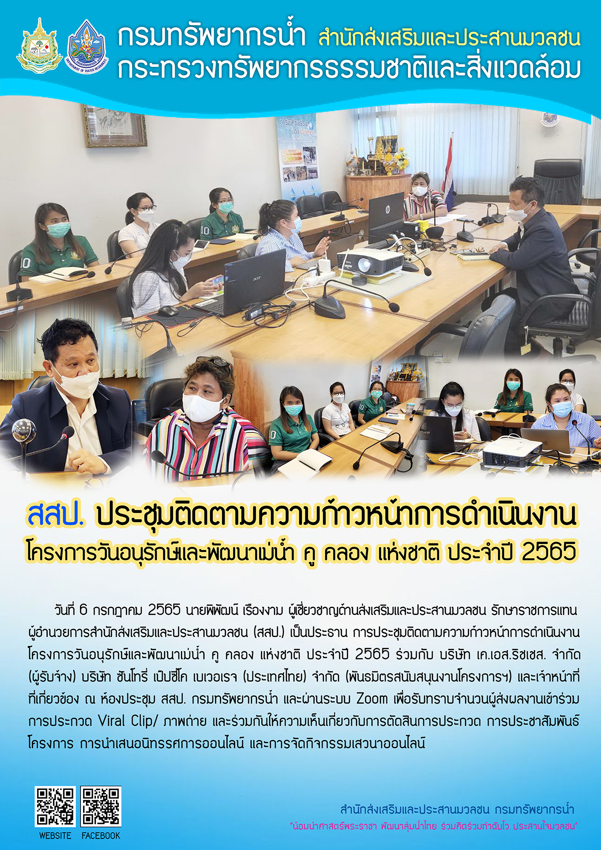 6 ก.ค. 2565 สสป. ประชุมติดตามความก้าวหน้าการดำเนินงานโครงการวันอนุรักษ์และพัฒนาแม่น้ำ คู คลอง แห่งชาติ ประจำปี 2565 ร่วมกับ บริษัท เค.เอส.ริชเชส. จำกัด (ผู้รับจ้าง) บริษัท ซันโทรี่ เป๊ปซี่โค เบเวอเรจ (ประเทศไทย) จำกัด (พันธมิตรสนับสนุนงานโครงการฯ) และเจ้าหน้าที่ที่เกี่ยวข้อง ณ ห้องประชุม สสป.