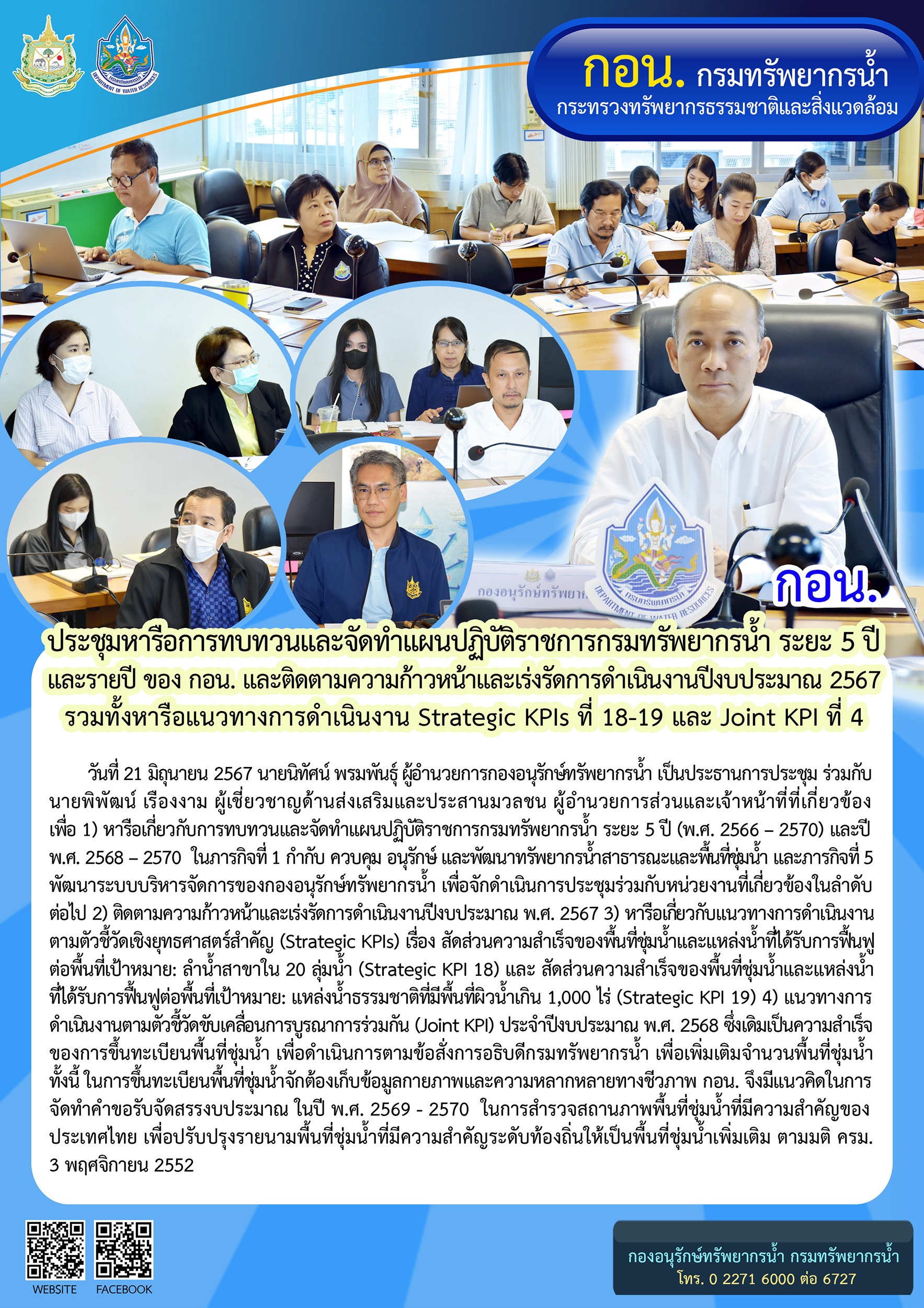 วันที่ 21 มิถุนายน 2567 นายนิทัศน์ พรมพันธุ์ ผู้อำนวยการกองอนุรักษ์ทรัพยากรน้ำ เป็นประธานการประชุม ร่วมกับ นายพิพัฒน์ เรืองงาม ผู้เชี่ยวชาญด้านส่งเสริมและประสานมวลชน ผู้อำนวยการส่วนและเจ้าหน้าที่ที่เกี่ยวข้อง ประชุมหารือการทบทวนและจัดทำแผนปฏิบัติราชการกรมทรัพยากรน้ำ ระยะ 5 ปี (พ.ศ. 2566 – 2570) และรายปี ของ กอน. และติดตามความก้าวหน้าและเร่งรัดการดำเนินงานปีงบประมาณ พ.ศ. 2567 รวมทั้งหารือแนวทางการดำเนินงาน Strategic KPIs ที่ 18-19 และ Joint KPI ที่ 4