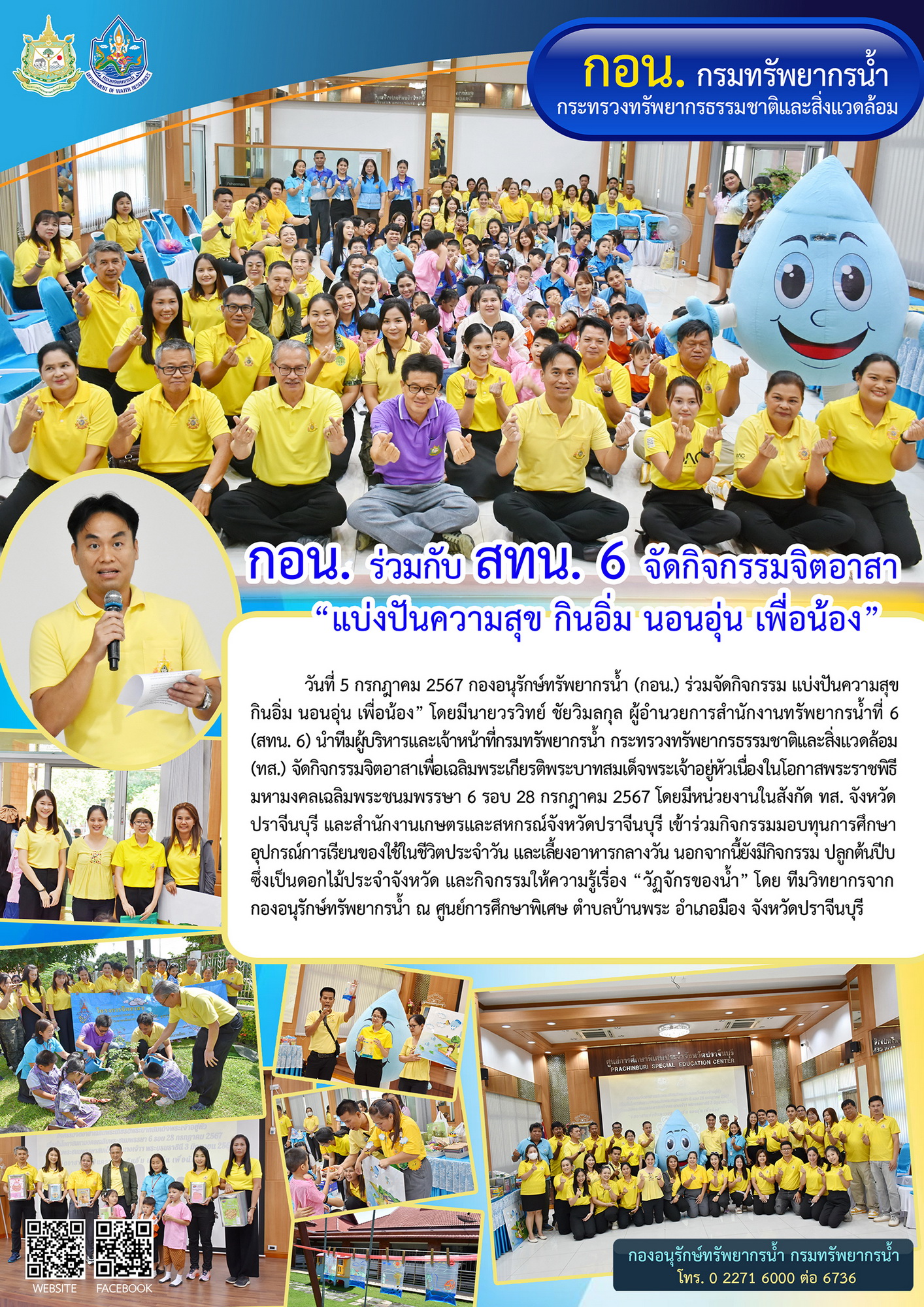 วันที่ 5 กรกฎาคม 2567 กองอนุรักษ์ทรัพยากรน้ำ (กอน.) ร่วมจัดกิจกรรม แบ่งปันความสุข กินอิ่ม นอนอุ่น เพื่อน้อง” โดยมีนายวรวิทย์ ชัยวิมลกุล ผู้อำนวยการสำนักงานทรัพยากรน้ำที่ 6 (สทน. 6) นำทีมผู้บริหารและเจ้าหน้าที่กรมทรัพยากรน้ำ กระทรวงทรัพยากรธรรมชาติและสิ่งแวดล้อม (ทส.) จัดกิจกรรมจิตอาสาเพื่อเฉลิมพระเกียรติพระบาทสมเด็จพระเจ้าอยู่หัวเนื่องในโอกาสพระราชพิธีมหามงคลเฉลิมพระชนมพรรษา 6 รอบ 28 กรกฎาคม 2567 โดยมีหน่วยงานในสังกัด ทส. จังหวัดปราจีนบุรี และสำนักงานเกษตรและสหกรณ์จังหวัดปราจีนบุรี เข้าร่วมกิจกรรมมอบทุนการศึกษา อุปกรณ์การเรียนของใช้ในชีวิตประจำวัน และเลี้ยงอาหารกลางวัน นอกจากนี้ยังมีกิจกรรม ปลูกต้นปีบ ซึ่งเป็นดอกไม้ประจำจังหวัด และกิจกรรมให้ความรู้เรื่อง “วัฏจักรของน้ำ” โดย ทีมวิทยากรจากกองอนุรักษ์ทรัพยากรน้ำ ณ ศูนย์การศึกษาพิเศษตำบลบ้านพระ อำเภอมืองปราจีนบุรี จังหวัดปราจีนบุรี