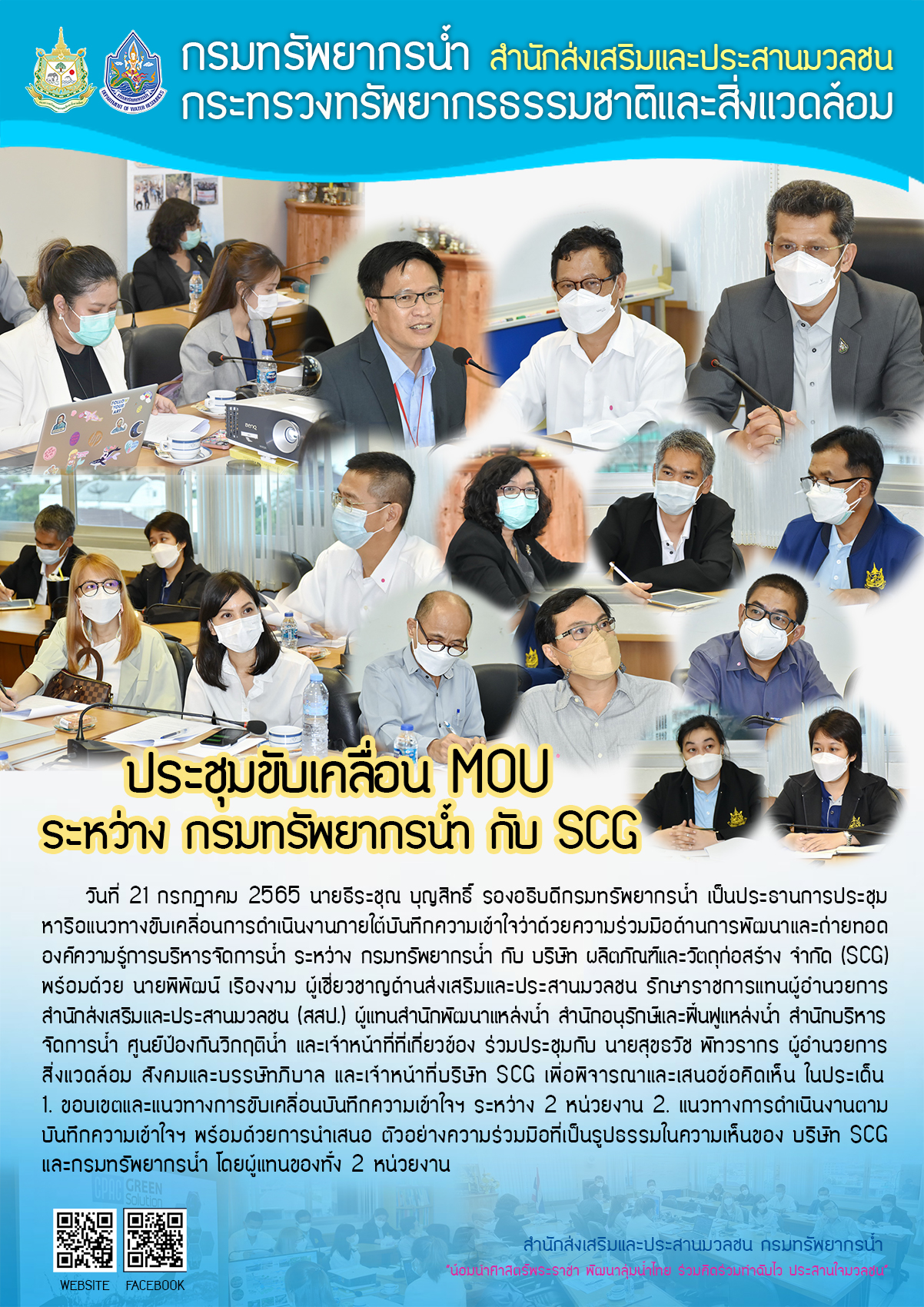 21 ก.ค. 2565 ประชุมหารือแนวทางขับเคลื่อนการดําเนินงานภายใต้บันทึกความเข้าใจว่าด้วยความร่วมมือด้านการพัฒนาและถ่ายทอดองค์ความรู้การบริหารจัดการน้ำ ระหว่าง กรมทรัพยากรน้ำ กับ บริษัท ผลิตภัณฑ์และวัตถุก่อสร้าง จํากัด (SCG)