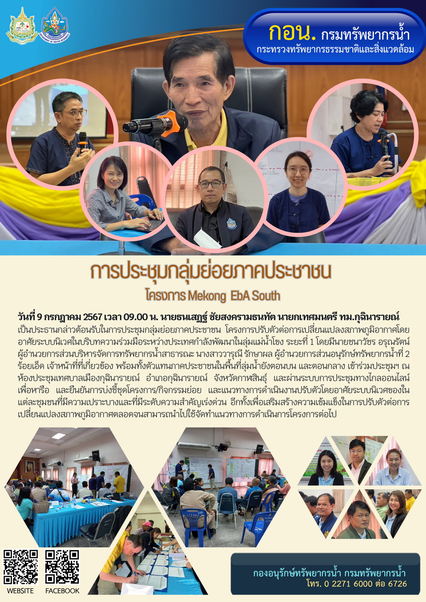 วันที่ 9 กรกฎาคม 2567 เวลา 09.00 น. นายธนเสฏฐ์ ชัยสงครามธนทัต นายกเทศมนตรี ทม.กุฉินารายณ์ เป็นประธานกล่าวต้อนรับในการประชุมกลุ่มย่อยภาคประชาชน โครงการปรับตัวต่อการเปลี่ยนแปลงสภาพภูมิอากาศโดยอาศัยระบบนิเวศในบริบทความร่วมมือระหว่างประเทศกำลังพัฒนาในลุ่มแม่น้ำโขง ระยะที่ 1 โดยมีนายชนาวัชร อรุณรัตน์ ผู้อำนวยการส่วนบริหารจัดการทรัพยากรน้ำสาธารณะ นางสาววารุณี รักษาผล ผู้อำนวยการส่วนอนุรักษ์ทรัพยากรน้ำที่ 2 ร้อยเอ็ด เจ้าหน้าที่ที่เกี่ยวข้อง พร้อมทั้งตัวแทนภาคประชาชนในพื้นที่ลุ่มน้ำยังตอนบน และตอนกลาง เข้าร่วมประชุมฯ ณ ห้องประชุมเทศบาลเมืองกุฉินารายณ์ อำเภอกุฉินารายณ์ จังหวัดกาฬสินธุ์ และผ่านระบบการประชุมทางไกลออนไลน์
