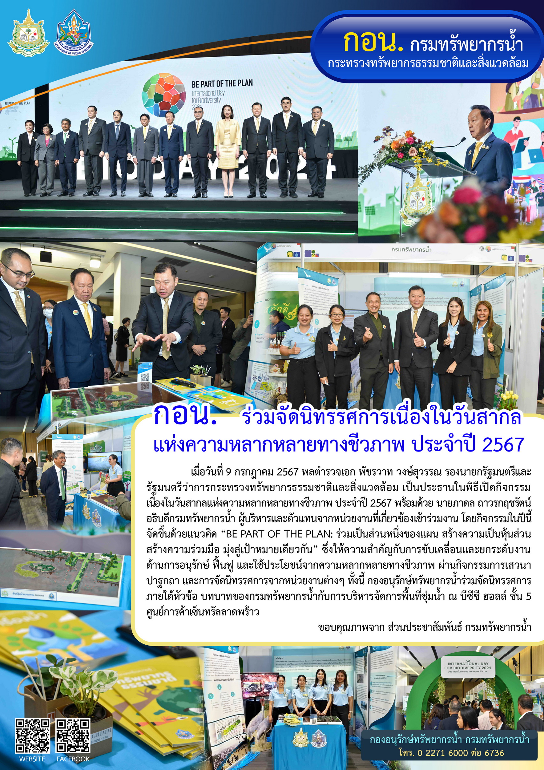 วันที่ 9 กรกฎาคม 2567 พลตำรวจเอก พัชรวาท วงษ์สุวรรณ รองนายกรัฐมนตรีและรัฐมนตรีว่าการกระทรวงทรัพยากรธรรมชาติและสิ่งแวดล้อม เป็นประธานในพิธีเปิดกิจกรรมเนื่องในวันสากลแห่งความหลากหลายทางชีวภาพ ประจำปี 2567 พร้อมด้วย นายภาดล ถาวรกฤชรัตน์ อธิบดีกรมทรัพยากรน้ำ ผู้บริหารและตัวแทนจากหน่วยงานที่เกี่ยวข้องเข้าร่วมงาน โดยกิจกรรมในปีนี้จัดขึ้นด้วยแนวคิด “BE PART OF THE PLAN: ร่วมเป็นส่วนหนึ่งของแผน สร้างความเป็นหุ้นส่วน สร้างความร่วมมือ มุ่งสู่เป้าหมายเดียวกัน” ซึ่งให้ความสำคัญกับการขับเคลื่อนและยกระดับงานด้านการอนุรักษ์ ฟื้นฟู และใช้ประโยชน์จากความหลากหลายทางชีวภาพ ผ่านกิจกรรมการเสวนา ปาฐกถา และการจัดนิทรรศการจากหน่วยงานต่างๆ ทั้งนี้ กองอนุรักษ์ทรัพยากรน้ำร่วมจัดนิทรรศการภายใต้หัวข้อ บทบาทของกรมทรัพยากรน้ำกับการบริหารจัดการพื้นที่ชุ่มน้ำ ณ บีซีซี ฮอลล์ ชั้น 5 ศูนย์การค้าเซ็นทรัลลาดพร้าว